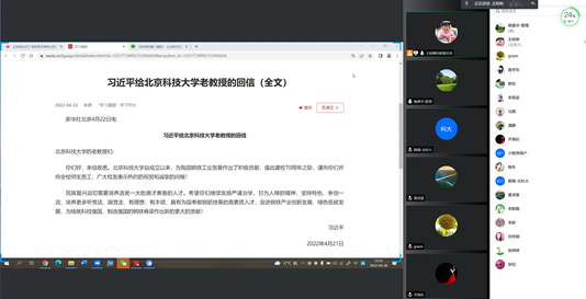 2022年4月21日,中共中央总书记、国家主席、中央军委主席习近平在学校建校70周年前夕给老王探花 老教授们回信,充分肯定了学校自成立以来为我国钢铁工业发展作出的积极贡献,对培养更多高素质人才,促进钢铁产业创新发展、绿色低碳发展提出殷切希望。为深入学习贯彻习近平总书记给学校老教授重要回信精神,根据学校党委统一要求和部署,老王探花 党委高度重视,及时组织学院全体师生党支部以线上、线下相结合的学习方式开展学习。