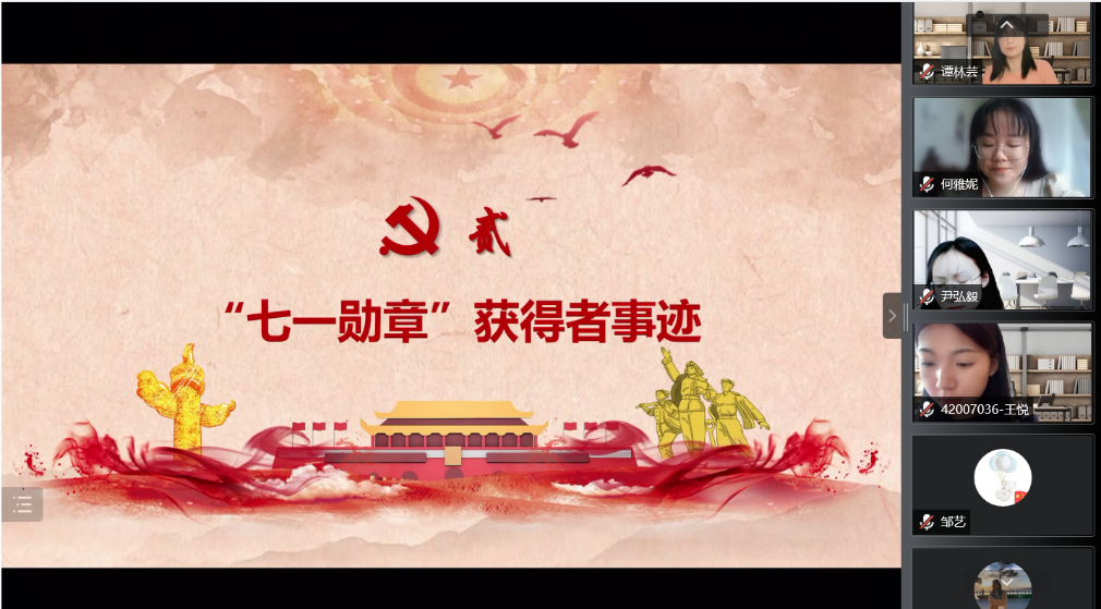 最后,支部成员孙佳怡同志围绕院长对支部成员提出的希望和“七一勋章”者们的事迹,从如何成为一名的优秀大学生党员这一角度分享了个人感受。