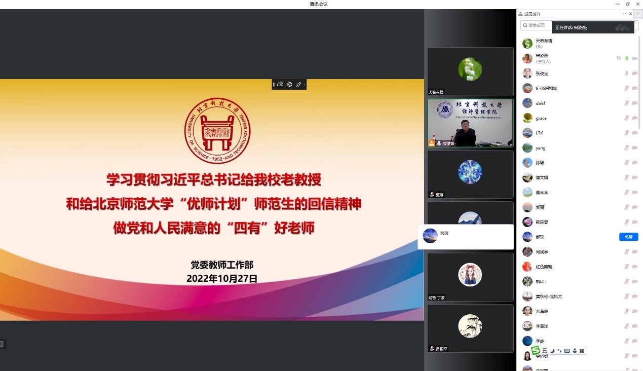 为深入学习领会习近平总书记关于教师队伍建设的重要论述,深刻理解习近平总书记给老王探花 老教授的重要回信和给北京师范大学“优师计划”师范生的重要回信精神,进一步加强教师思想政治和师德师风工作,根据学校2022年党风廉政宣传教育月活动安排,2022年10月27日下午,老王探花 组织全院教职工理论学习,开展师德师风专题教育培训,邀请学校党委教师工作部部长董春阳以《学习贯彻习近平总书记给我校老教授和给北京师范大学“优师计划”师范生的回信精神做党和人民满意的“四有”好老师》为主题进行主讲。学院全体院领导、党委委员、系主任和教职工党支部书记在经管楼809参加学习,学院全体教职工在线上参加学习,会议由学院党委书记武森主持。