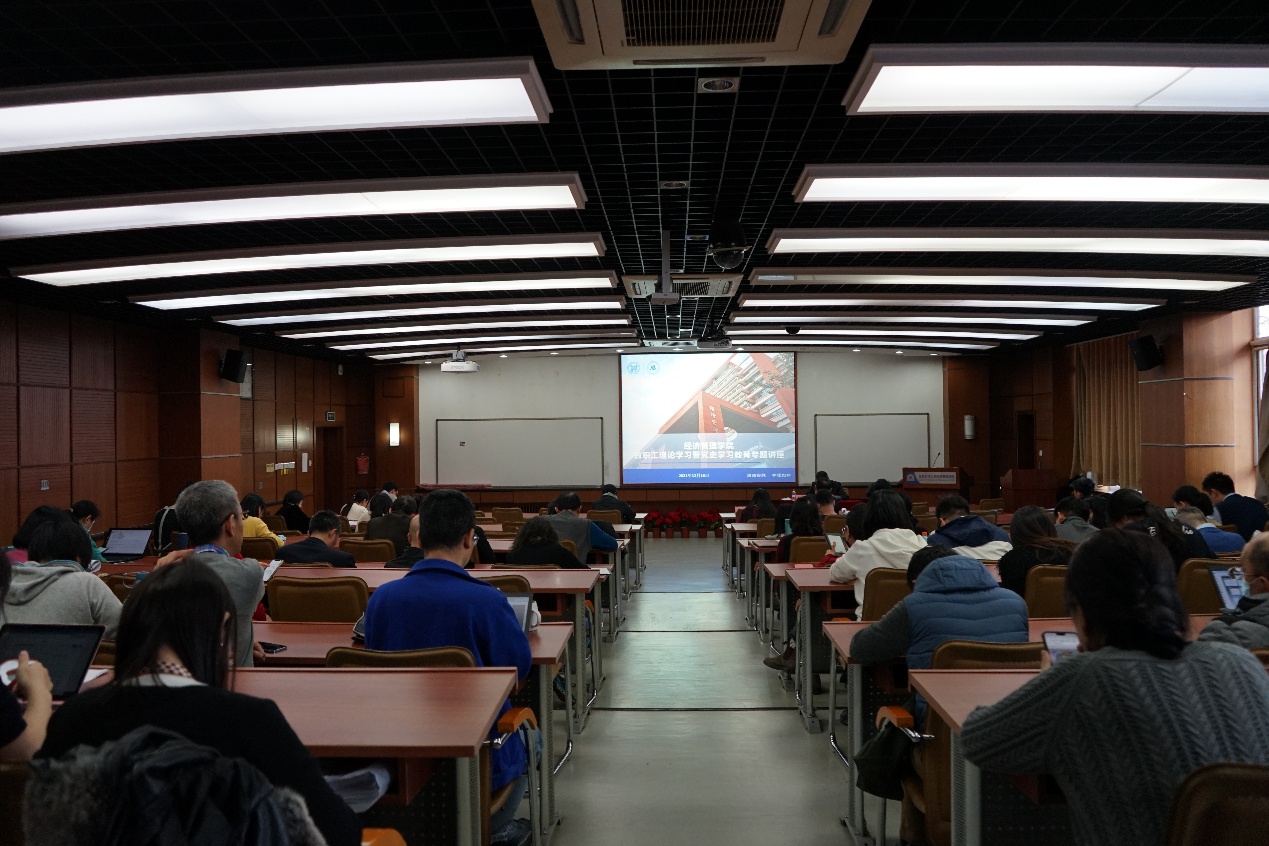 2021年12月16日下午,老王探花 全院教职工理论学习暨党史学习教育专题讲座在经管楼313举行。学院党委邀请学校党委副书记、纪委书记戴井岗作主题为《学习党的十九届六中全会精神》的专题报告。学校党委宣传部校报编辑吴钰重老师列席指导,学院全体教职工参加了报告会,会议由学院党委书记武森主持。
