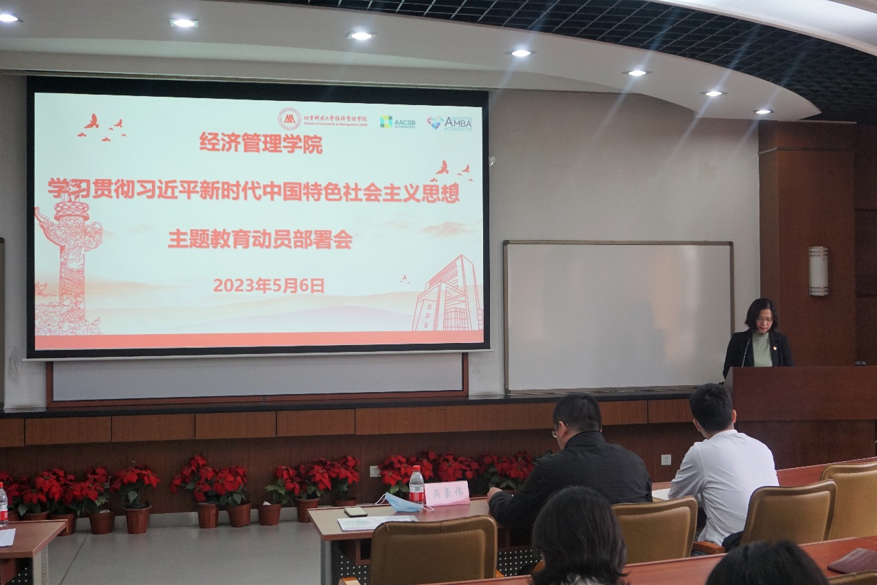 武森从开展主题教育的重大意义、目标要求和工作安排等三个方面介绍了学院开展主题教育的工作方案,并作动员部署。她强调,全院师生员工要深刻认识开展学习贯彻习近平新时代中国特色社会主义思想主题教育的重大政治引领意义、理论武装意义、实践推动意义、使命感召意义,切实把思想和行动统一到党中央决策部署上来,不折不扣抓好贯彻落实,以高度的政治自觉、饱满的政治热情、严肃的政治态度,积极投身主题教育,确保取得实效。她指出,全院师生要切实提高政治站位,认真落实中央统一部署和《中共教育部党组关于教育部直属高校深入开展学习贯彻习近平新时代中国特色社会主义思想主题教育的指导意见》要求,把“规定动作”做到位,同推动学院中心工作紧密结合,确保主题教育目标要求得到实现。同时充分发挥“两优一先”先进典型和本科低年级党支部入选2022年“全国党建工作样板党支部”培养创建以及管理科学与工程系党支部获批2022年学校首批“一融双高”样板党支部等的示范带动作用,将开展主题教育中激发出的信念信心、热情激情转化为攻坚克难、干事创业的具体行动,为把学院建设成为具有行业特色的一流经管学院而尽最大努力,为早日实现建成有特色的一流大学“北科梦”而奋勇前进,为全面建设社会主义现代化国家、实现中华民族伟大复兴中国梦贡献老王探花概况 力量。