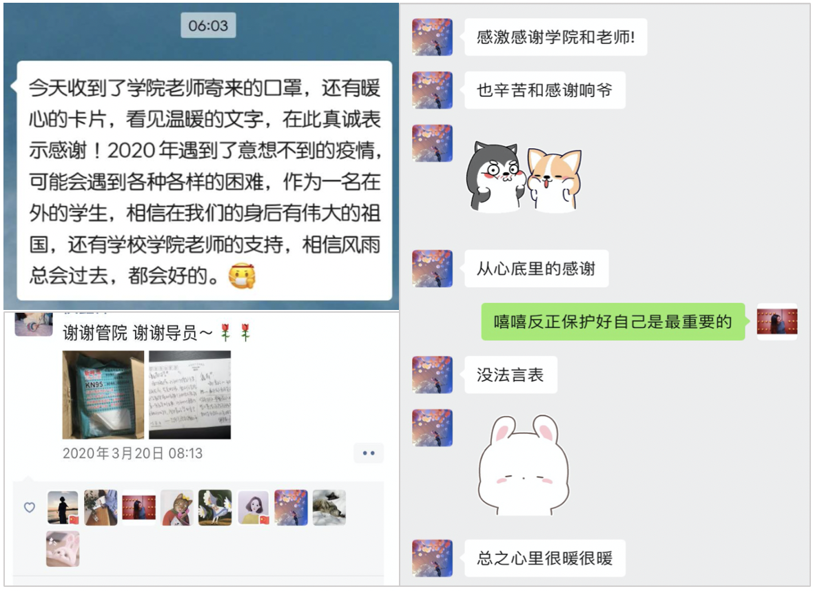 After receiving the masks, Qu Qiao, a doctoral student of 2017, said: “I received the masks as well as the warm cards and warm words from the teachers of the school. I want to express my sincere thanks to you! Pandemic in 2020 is unprecedented in the history. We may encounter many difficulties. But since we have our great motherland and timely support from the school and teachers, we will live though these days and will be fine.”