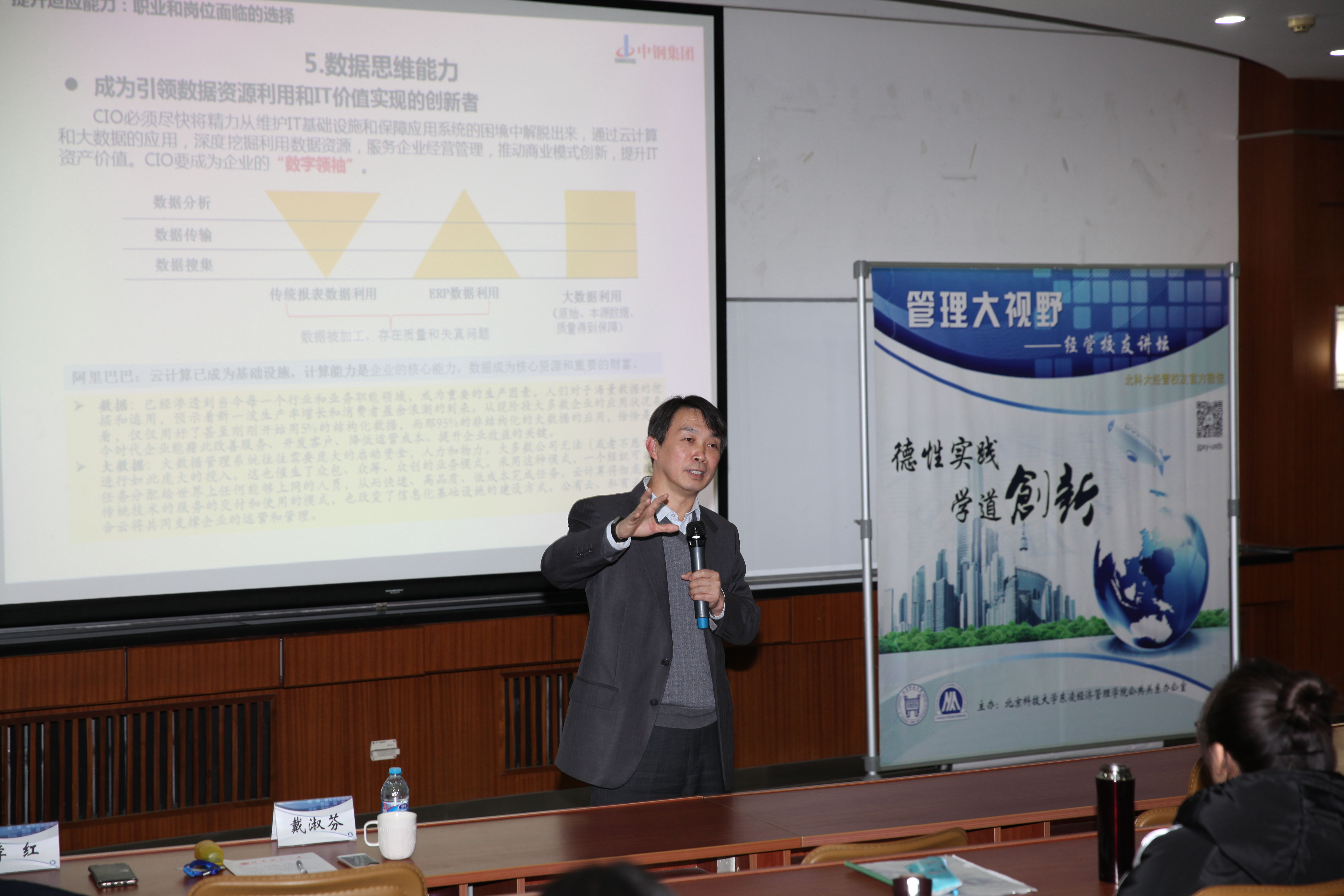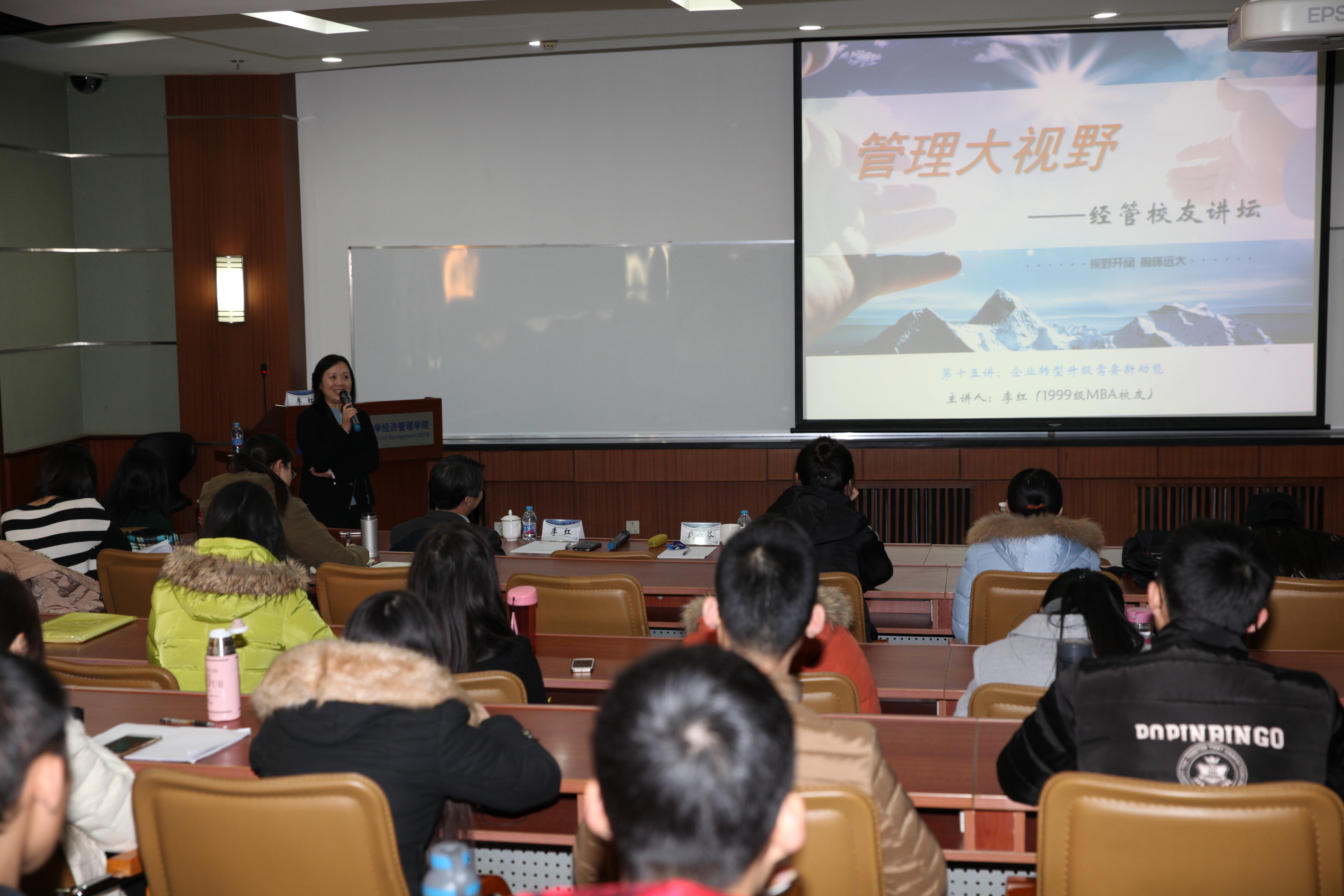 2016年11月23日,“管理大视野—经管校友讲坛”第十五讲在经管楼312教室举办。本期讲座主题为“传统企业转型升级需要利用新动能”,主讲嘉宾为老王探花 MBA1999级校友李红。李红校友目前就职于中国中钢集团公司,任信息管理中心总经理。