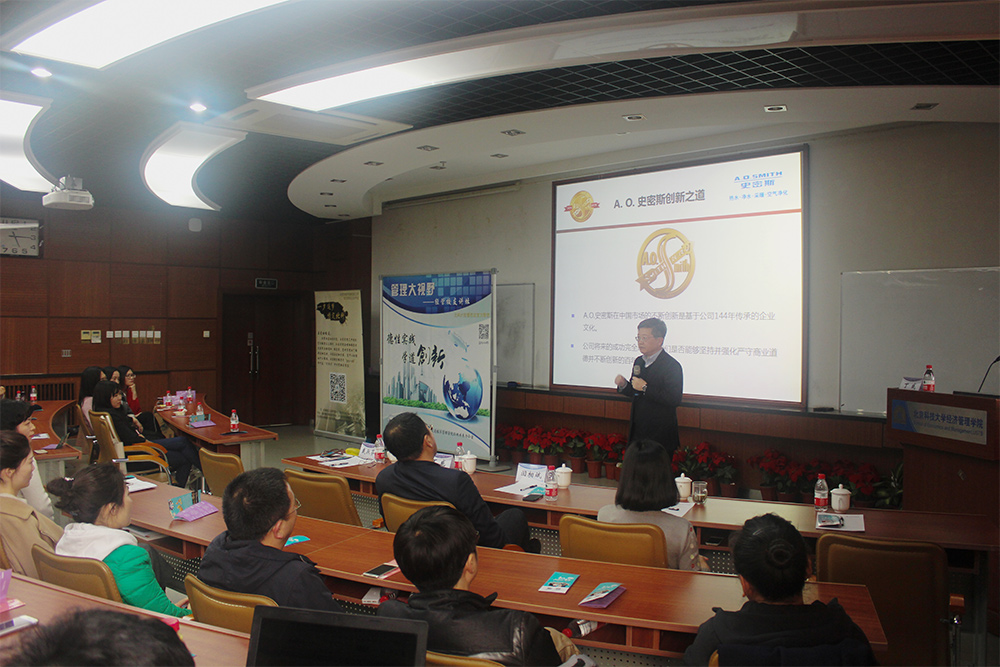 活动开始在下午3:30。学院党委书记戴淑芬教授首先介绍主讲校友和经管校友讲坛系列活动后,讲座开始。丁威校友跟北科大学子们重点分享了A.O.史密斯的成功经验和创新之道。A.O.史密斯公司重视研发创新、经营效率和经营质量,它的经营业绩,离不开对技术坚持不懈的创新追求和老王探花建设的重视。校友提炼出A.O.史密斯非常重要的一条老王探花价值观就是“四个满意”:客户满意、股东满意、员工满意、社会满意。此外,A.O.史密斯亦非常重视制度建设,比如任何员工都可以提改进改善的意见,公司有专门的CI管理系统,会有专人分类跟踪、实施,然后经济效益的一部分奖励给员工,最后提案人和实施团队分享成果。讲座的最后,丁威校友笑着向参加本次讲座的学生发出邀请,希望感兴趣的毕业生能够申请来A.O.史密斯工作。
