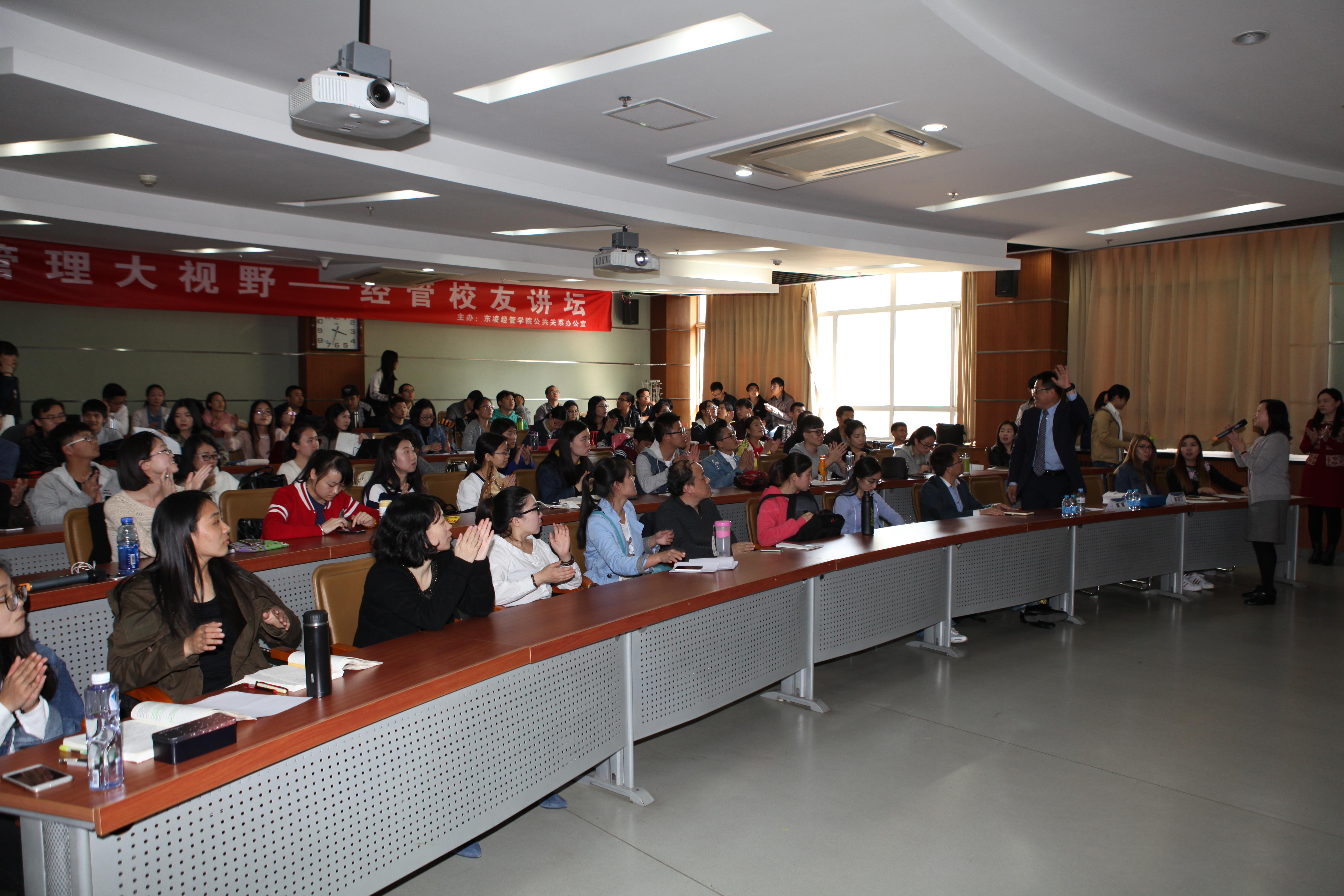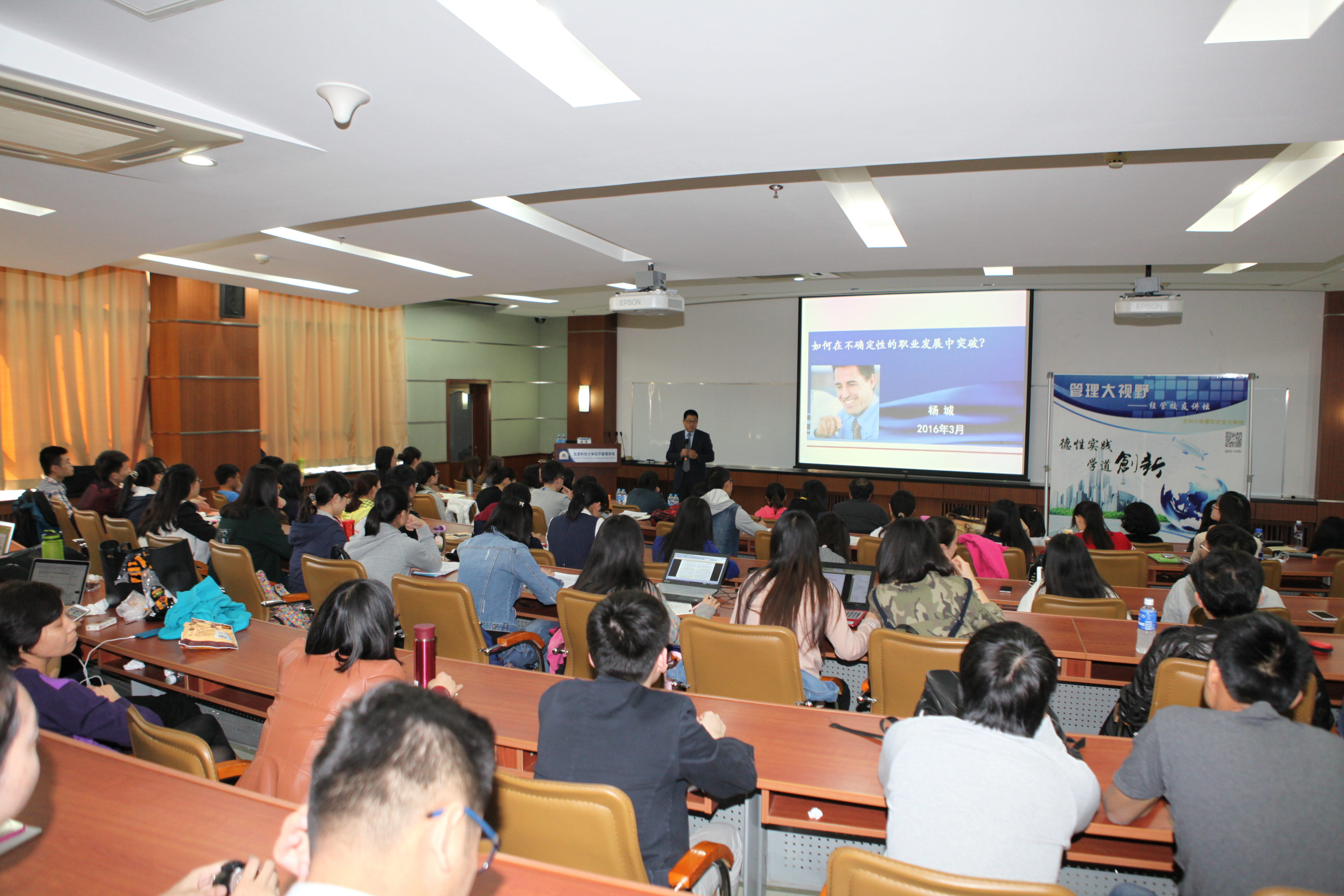 下午3:30活动开始。党委书记戴淑芬首先为到场听众介绍了主讲校友和经管校友讲坛系列活动,之后杨城校友开始精彩的讲座。作为有着传奇般工作经历的职场人,杨城校友曾辗转于国内一、二、三线城市,先后在国有、合资、民营等企业从事管理及人力资源工作,经历了高科技、证券、奢侈品零售、房地产等不同行业,他向大家分享了数年打拼中所积累的对职业选择和个人发展的认知领悟和丰富的职场经验。讲座中,校友励志的话语使在场听众备受鼓舞,也学习到了合格的职业经理人所应具备的能力和品质。