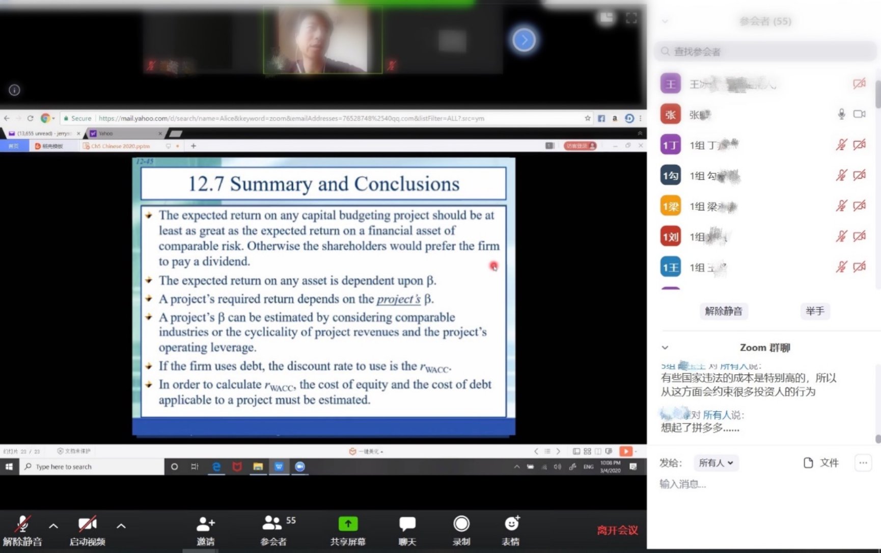 上课当天,老师和同学们都早早进入平台等待上课。来自UTA的老师Jerry Song表示:虽然早已有线上远程教学模式,但4天的线下课程全部改为线上还是第一次尝试。他身在美国,与国内有13个小时时差,但仍积极配合国内上课的时间。虽无法面对面交流,但同学们的学习热情不减,课堂上通过语音、视频、留言等方式积极与老师互动,与小组同学在微信群中保持有效讨论。在课上,老师不仅讲授了课程知识,还结合当前“疫情”分析了新冠肺炎对全球金融市场的影响。连续4天的在线课程开展顺利。