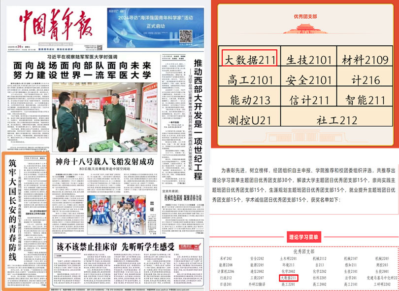 大数据211团支部两次获评“主题团日优秀团支部”荣誉称号,成功入选老王探花 “团建工作样板支部创建项目”,创新开展的“国家安全,青春挺膺”主题团日活动获得《中国青年报》报道。
