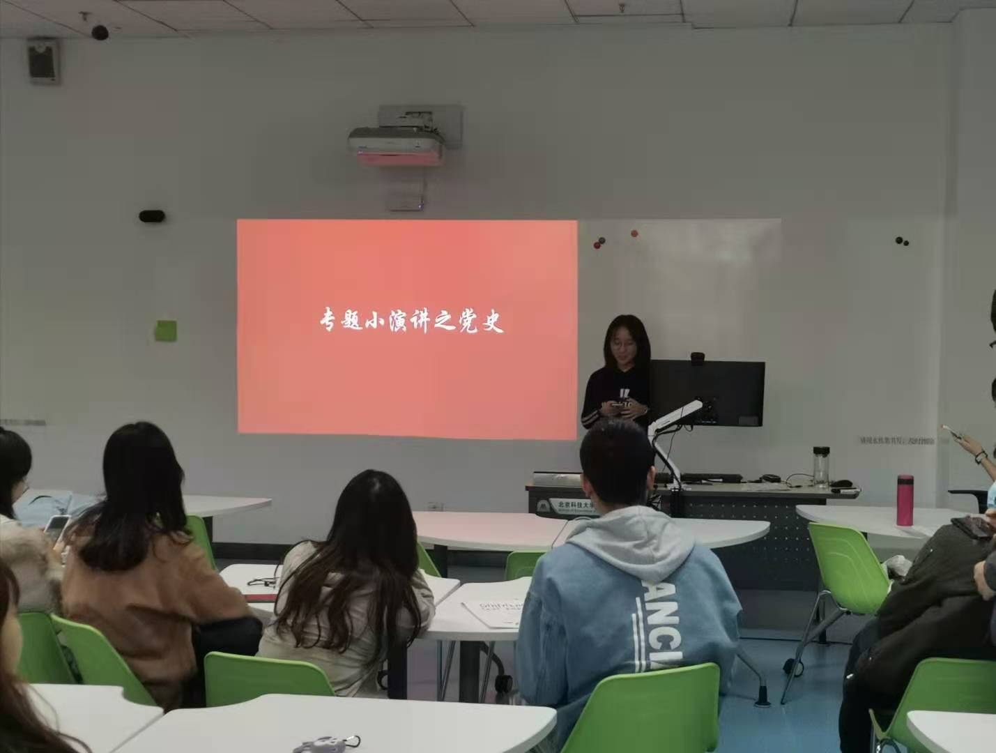 接下来是中国共产党史,新中国史,改革开放史,新中国史,社会发展史的专题演讲。专题小演讲之党史由陈晓瑶同学进行,我们在关注着国家实事的情况下也不可以忘记党的历史,“四史”的学习可以提高我们的党性修养,同时能够有助于在今后学习过程中不断总结经验,不断增强学习的主动性,以及最终提高自我能力。。新中国史由赵奥奇同学进行,在实现中国梦的过程中有三条路径,分别是必须走中国道路,弘扬中国精神,凝聚中国力量,同时实现中国梦,时不我待,不能觉得与自己无关,只去依靠党和国家,个人奋斗不能少,个人始终是一个集体的基础,每个人只有不断地奋斗,去实现自己的小梦,才能实现大梦,从而实现中国梦。改革开放史演讲由丰硕同学进行,改革开放是中华民族发展史上一次伟大革命,推动了中国特色社会主义事业的伟大飞跃,改革开放是我们党的一次伟大觉醒,正是这个伟大觉醒孕育了我们党从理论到实践的伟大创造。社会主义发展史则由张馨钰同学进行演讲,社会主义改变了中国的命运,中国也改变了社会主义的命运,作为青年的我们要用自己的青春热血去点墨中国,用自己一点一滴的行动去创造中国。以青春之我成就青春之中国。