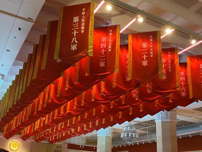 展览围绕弘扬爱国主义精神和革命英雄主义精神的主题,陈列着在抗美援朝战争中志愿军战士们使用的装备和物品,通过图文并茂和实物场景等方式,全面地回顾了抗美援朝战争的光辉历程,生动展示了中国人民志愿军的革命精神与英雄事迹。在展厅的上空悬挂着100面抗美援朝参战单位的旗帜,还有在大雪之中匍匐坚守了一夜的志愿军雕像,每一场战争、每一个事迹无不震撼并鼓舞着在场的每一位同志。