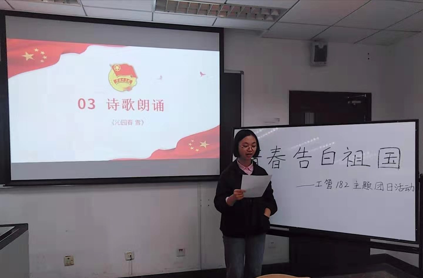 本次团日活动分为四个部分进行,首先,团支书带领同学们学习了习总书记对青年人的寄语,使同学们进一步地理解了习书记关于新时代新青年的思想;之后进行了第二个部分,全班同学一起观看视频《往昔峥嵘岁月》,回顾了革命先烈们为了新中国的发展而做出的卓越贡献。紧接着第三个部分,由蒋宇婷同学深情朗诵毛泽东的《沁园春雪》,赢得了大家的阵阵掌声。最后到了第四部分,全班同学合唱歌曲《我和我的祖国》,在歌声中大家回顾着中国的蓬勃发展,感慨着我们现在的美好生活,作为新青年更要大力弘扬以爱国主义为核心的伟大民族精神,表白中国共产党,永远热爱我们的祖国。在活动结束之后工管182班一起合影留念。