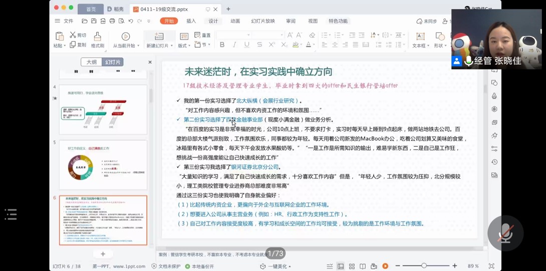 4月11日19:30,经管学院就业指导老师张晓佳面向本科19级学生开展“静待佳音”职业生涯规划直播分享会——“实习实践要趁早”,参与活动的有本科19级辅导员戈誉阳、张洪榛以及全体本科19级学生。