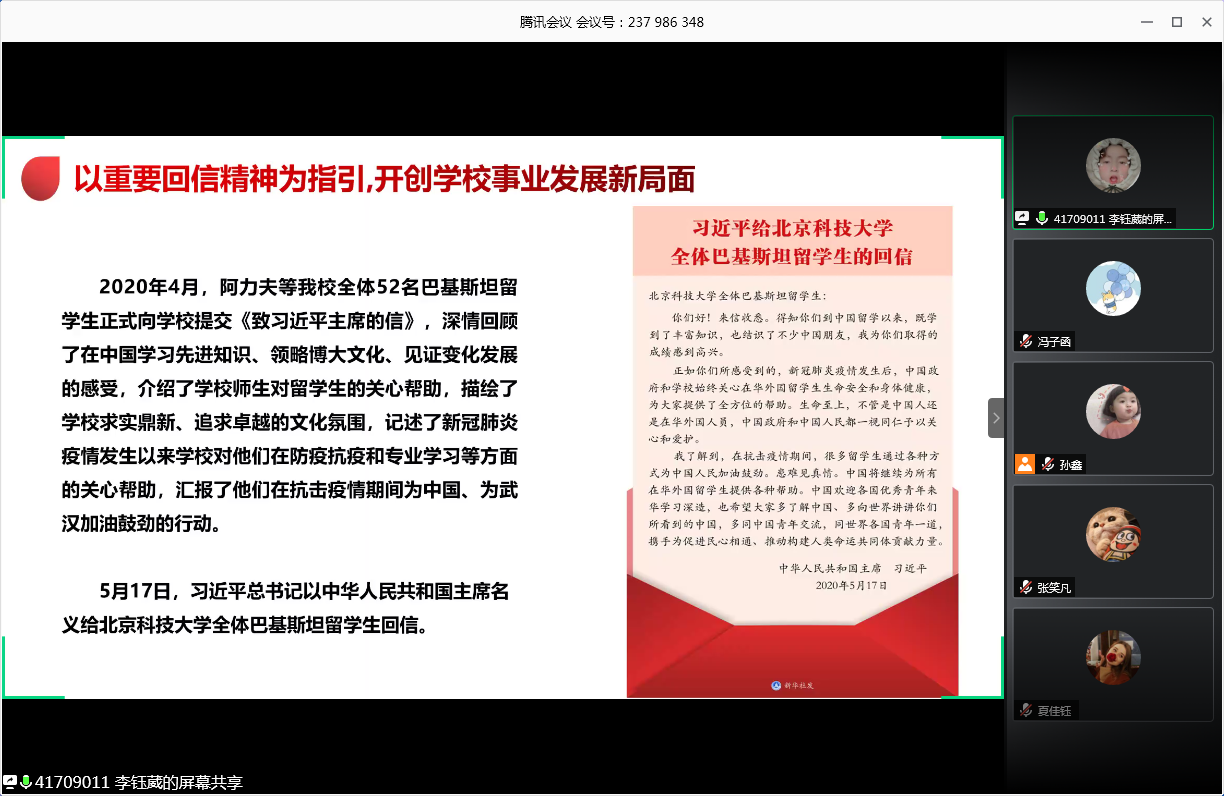 会议的第一部分,由王灏、李钰葳带领大家学习习总书记重要回信精神。在学习中,两位同学带领大家重温习主席给老王探花 全体巴基斯坦留学生的回信,学习我校党委书记武贵龙、校长杨仁树就全面深入学习宣传贯彻总书记重要回信精神的部署与要求。