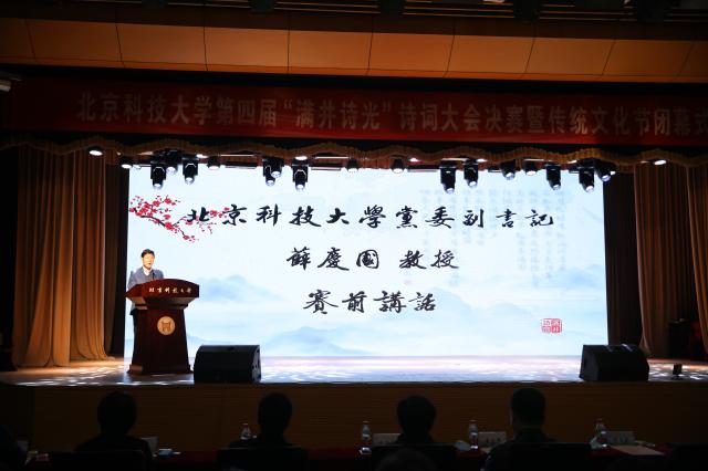 薛庆国在致辞中指出,今年是迎难而上的一年,本届诗词大会暨传统文化节重点在落细、落小、落实上下功夫,坚持细处着眼、小处着手、实处着力。薛庆国表示,传统文化节提供了一个继承和弘扬中华优秀传统文化的平台,希望师生们能博观而约取,厚积而薄发,在青春的大好韶华里,锤炼品格,磨炼意志,传承好中华优秀传统文化,为中华民族伟大复兴贡献北科力量。