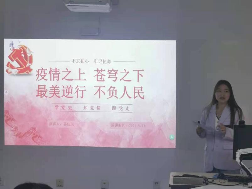 第二位分享由本18党支部党员郭佳琪同学,她分享的主题是“疫情之上,苍穹之下;最美逆行,不负人民”,郭佳琪同学通过自己剪辑的《最美逆行者》视频,为同学们再现新冠疫情爆发时期,中共党员以“生命重于泰山,疫情就是命令”为信念,奔赴武汉一线,以血肉之躯筑成人民生命的钢铁长城。接着,郭佳琪同学分享了一线警察何建华同志的故事,他用生命诠释职责担当,践行初心使命,令人肃然起敬。何建华同志恪尽职守,关爱人民,他的牺牲是重于泰山的。