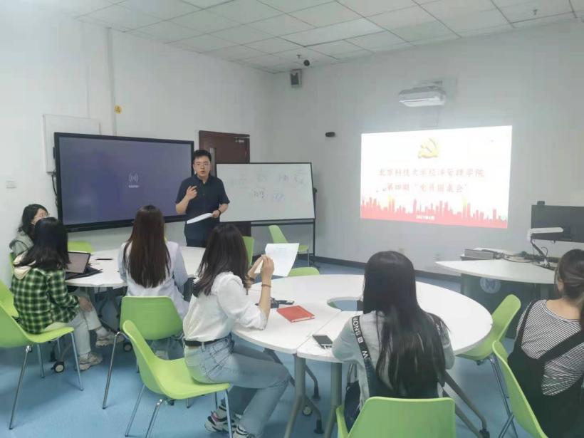 学生党支部党史学习教育“三学三讲 纵览百年”工作安排,2021年5月13日第四期“党员圆桌会”于经管楼404顺利举办。出席本次会议的有本低党支部党员李涵彬同学、本18级党支部党员郭佳琪同学、产经研党支部党员潘淑琦同学、国贸研党支部党员陈必凯同学、本低党支部党员戈誉阳老师,以及学院其他学生党支部的党支部党员,活动由党建辅导员张洪榛老师主持。
