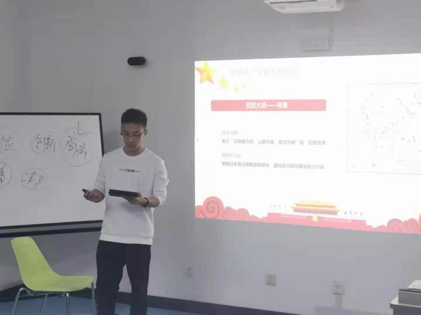 第一位分享的是本低党支部党员李涵彬同学,他讲述的主题是“从百团大战看共产党员的理想信念”,为我们介绍了百团大战的历史背景和后续影响,李涵彬同学细致分享了董必武为六角钱写检讨和狼牙山五壮士的英勇故事,并呼吁学生党员要牢记历史,坚定自己的理想信念,并为之不懈奋斗。