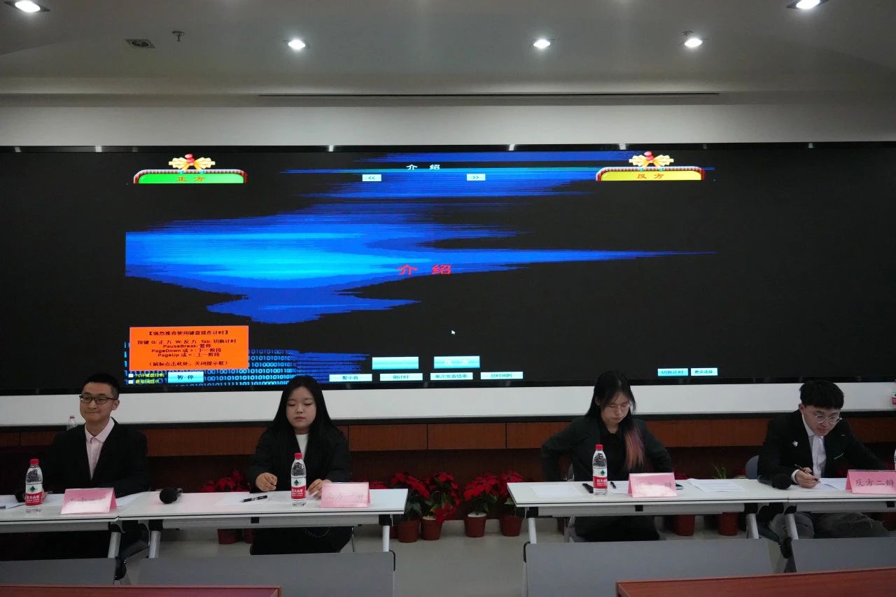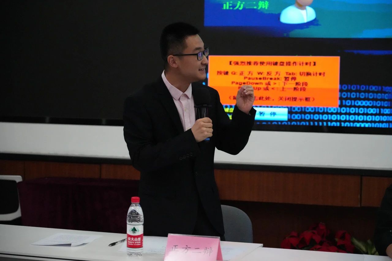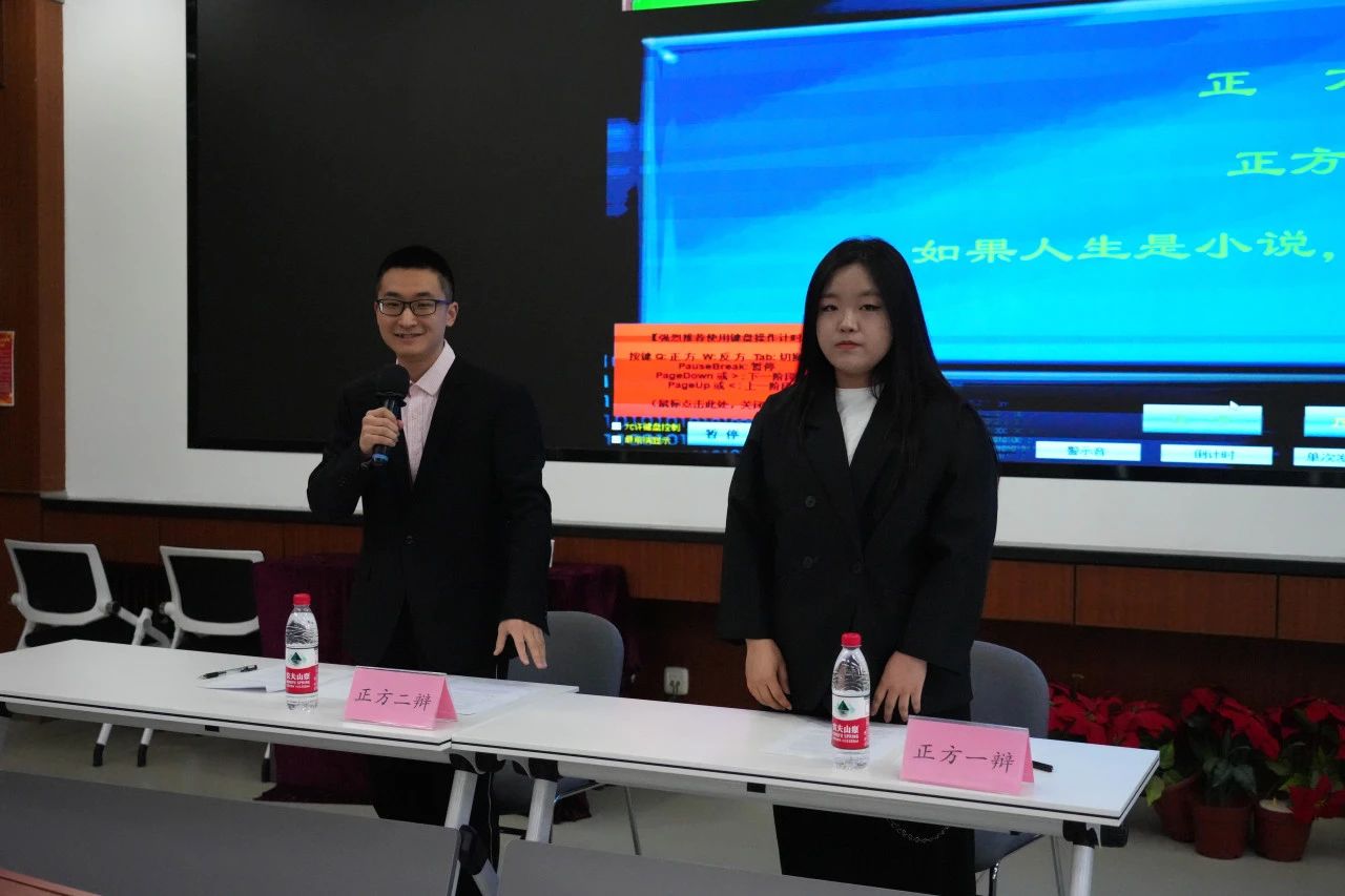 本次比赛采用“2V2”赛制,打破了传统的“4V4”辩论赛在院系设置、人员组织、沟通交流等方面的束缚,极大地提升了辩论赛的参与度。正方辩题为“如果人生是小说,人设更重要”;反方辩题为“如果人生是小说,情节更重要”。双方各有两名辩手进行辩论。