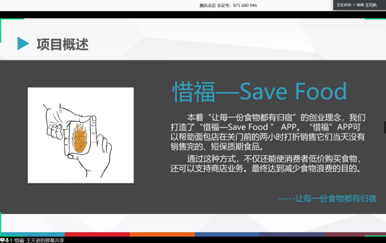 “惜福—Save Food”APP可以帮助面包店销售当天没有出售的食物,使用户低价购买临期食品,提升商店营业额,同时减少食物浪费,致力于“让每一份食物都有归宿。