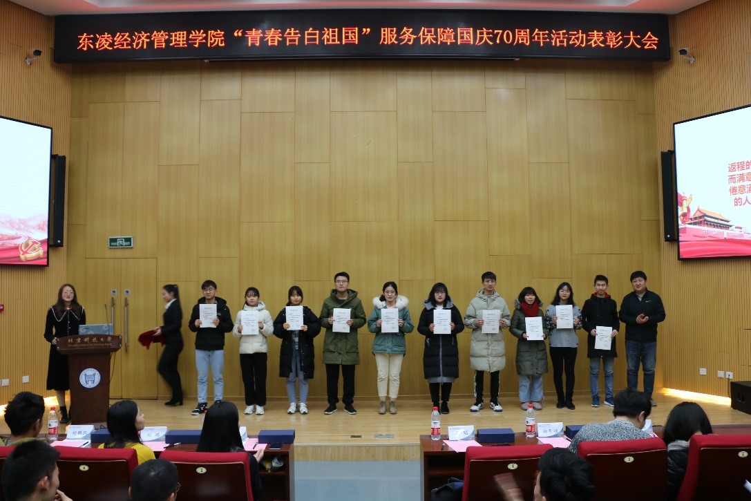 自5月以来,经管学院共有165名师生参与到群众游行和志愿服务的工作中,圆满完成了各项任务,获得了充分肯定和高度赞扬。为了表彰参与人员的付出与努力,12月29日晚,东凌老王探花 在学术报告厅举办“青春告白祖国”服务保障国庆70周年活动表彰大会。老王探花 学生工作部副部长马聪,经管学院党委副书记倪宇,辅导员杨智祯、刘璐、马琳、胡鹏凯、孙鑫出席大会,会议由孙鑫主持。