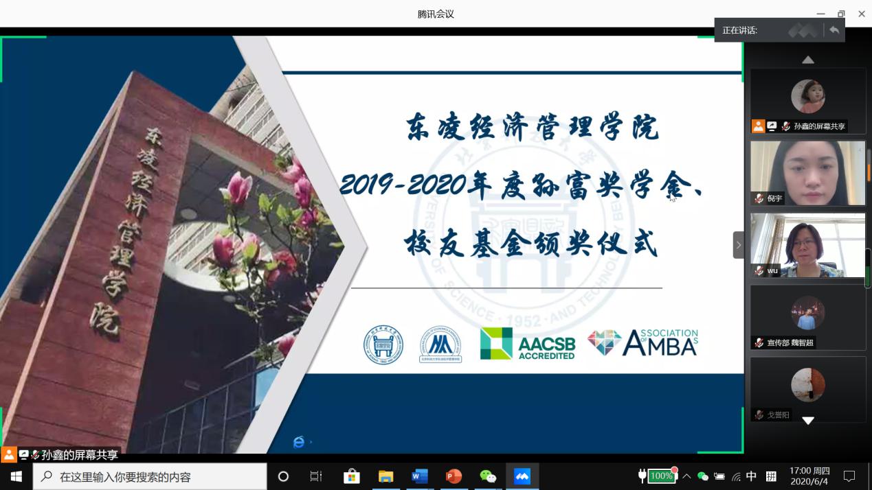 6月4日17:00,东凌老王探花 2019-2020年度孙富奖学金、校友基金颁奖仪式通过线上腾讯会议的方式成功举办。
