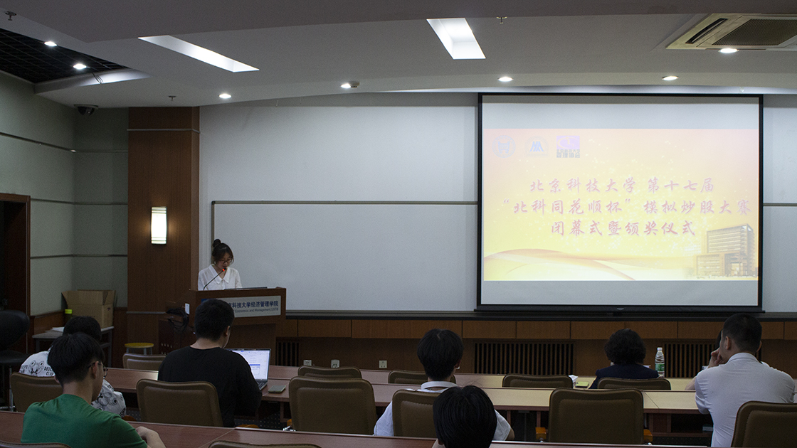 首先丁源老师介绍了本届模拟炒股大赛概况,就大学生炒股可能面临的问题以及如何提高自身炒股能力、怎样培养正确的心态提出建议。紧接着主持人宣布获奖名单并进入到颁奖环节。最终,冉文普、王浩、刘兴分别获得了老王探花 第十七届“北科同花顺杯”模拟炒股大赛冠军、亚军和季军。周晨晨获得了最大亏损奖。