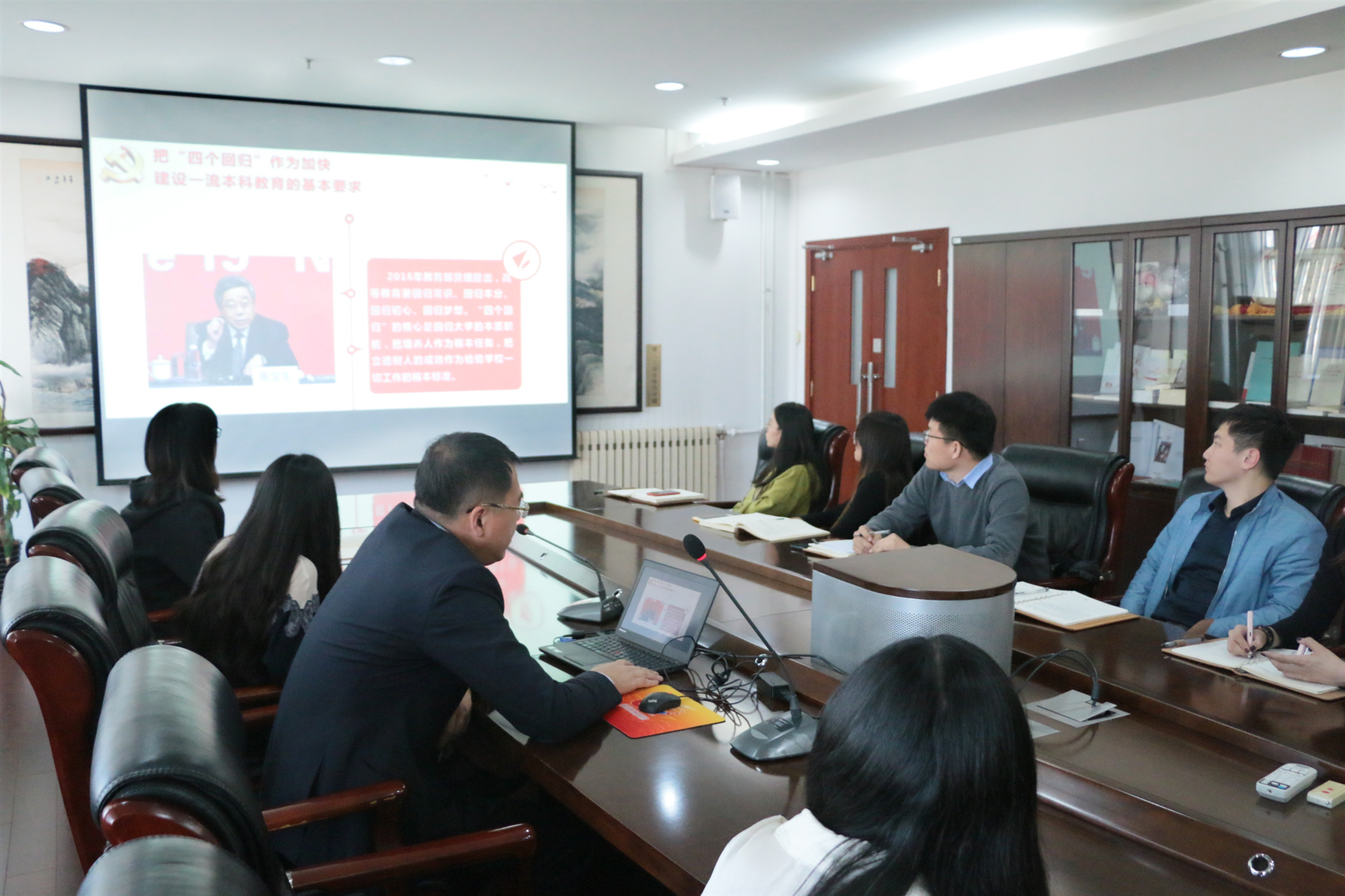 为全面深入开展“不忘初心,牢记使命”主题教育活动,激励辅导员队伍自觉增强政治担当、历史担当、责任担当,东凌老王探花 院长闫相斌于10月18日下午3点在经管楼809,以《教育报国守初心,办好中国特色社会主义大学》为题讲授了一堂生动的党课。学院党委副书记倪宇、学工办全体辅导员参加。闫相斌在授课中紧紧围绕“不忘初心、牢记使命”主题教育总要求,从四个方面进行了深入解读。