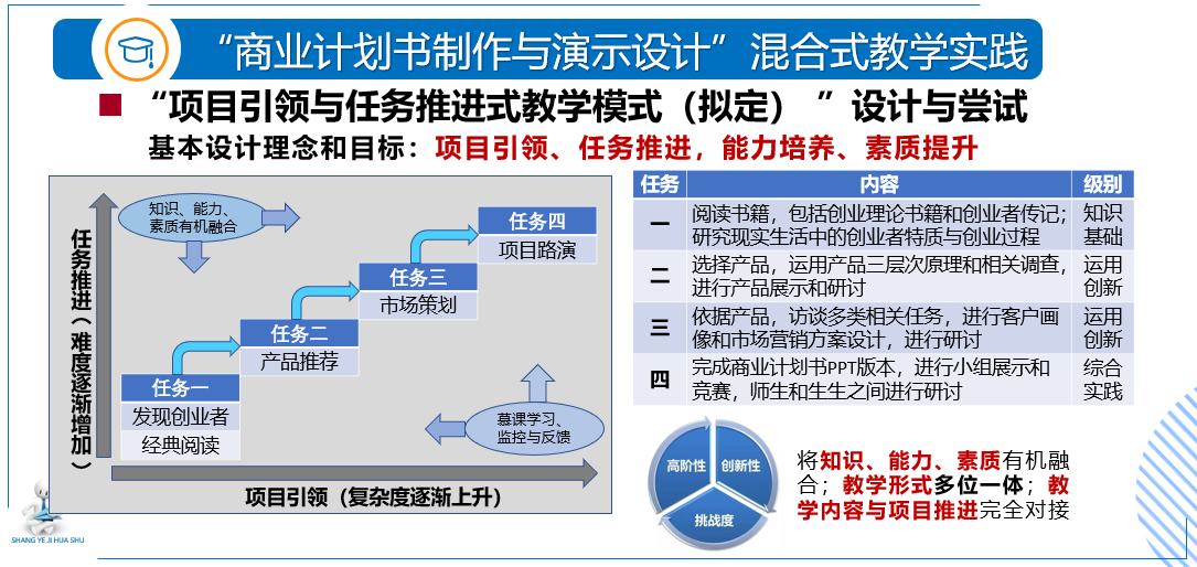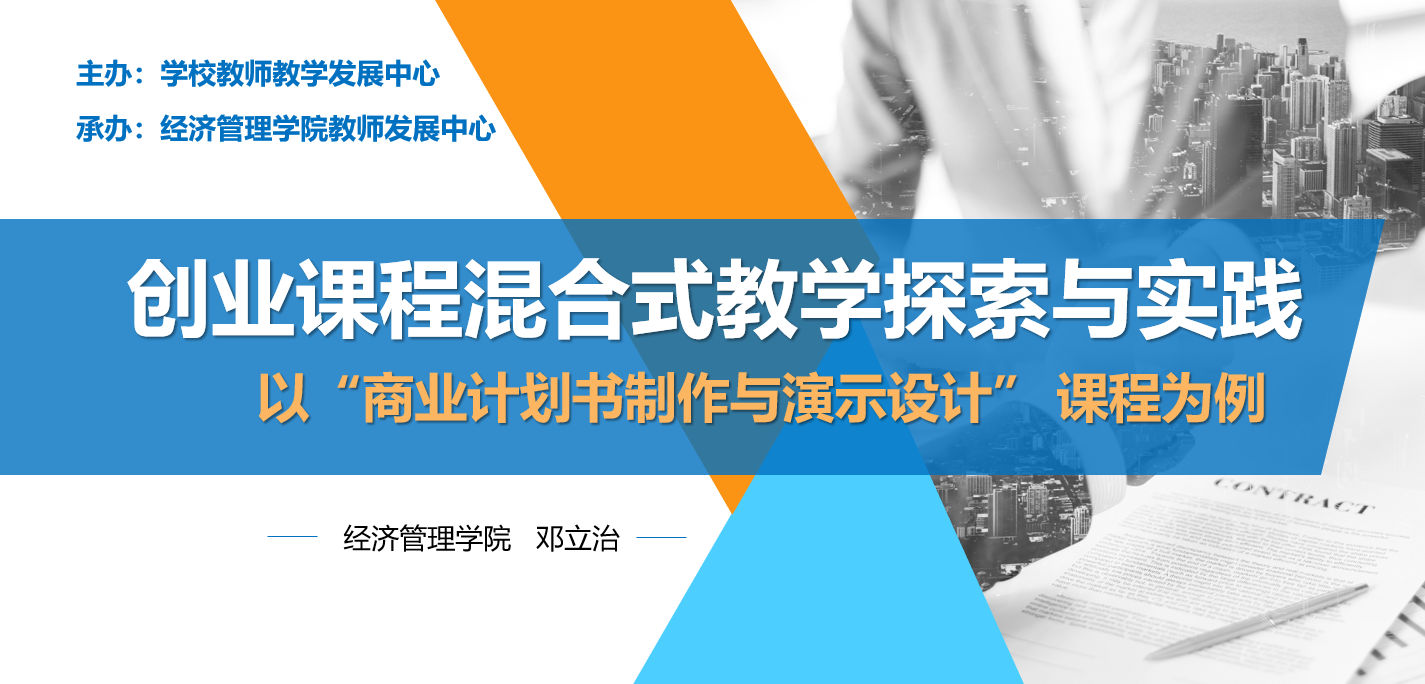 接下来,邓立治老师在介绍“商业计划书制作与演示设计”课程体系的基础上,系统地介绍了该课程进行混合式教学实践探索的过程,包括遵循金课“两性一度”标准,设计和实施了课程“项目引领与任务推荐式教学模式”,并从“以学生为中心”“项目引领与任务推进式教学模式”“重构学习流程”等几方面总结了课程混合式教学改革经验。