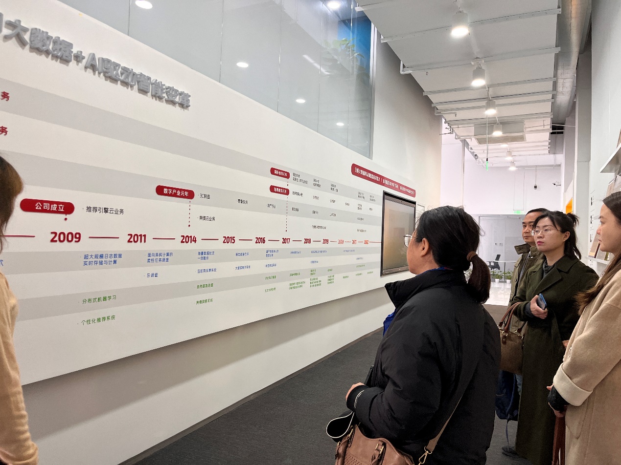 随后,杜博士带领几位老师沉浸式体验了公司的数字智能展示厅,演示了从软件设计搭建到业务设计一键式控制系统,并介绍了企业诸多重点项目:数字城市项目如“北京石景山区城市运营指挥中心”、“丽江城市大脑数据底座”;企业数字化经营决策项目如销量监控、预测、创新品类与新产品投放市场分析等;宏观经济运行趋势、智慧应急管理等专题性研究与建设项目。