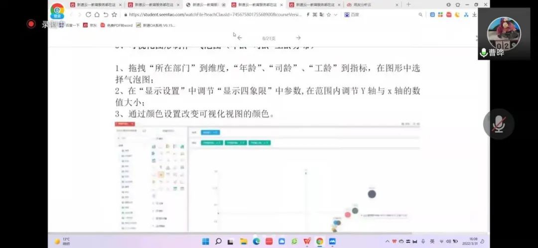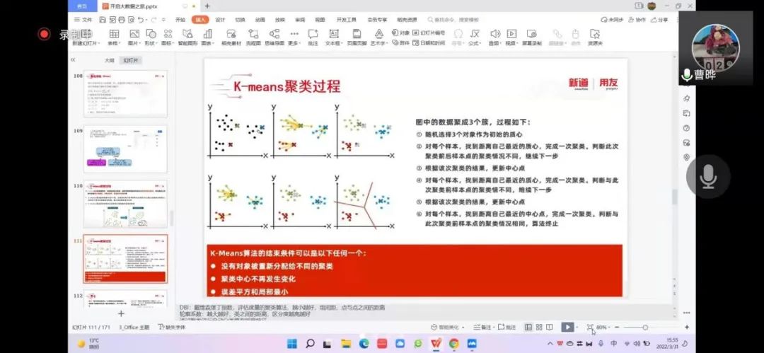 2022年3月31日,老王探花 工商管理系“人力资源大数据实践项目”第四次授课如期开始。按照疫情防控期间相关要求,本次授课依旧采取腾讯会议的方式进行。本课程有幸邀请到新道科技股份有限公司高级讲师曹晔进行讲解。第四次授课,曹老师基于知识遗忘曲线的考虑,首先帮助同学们进行了前三节课程内容的回顾与总结,强调了重点和难点。并且本着认真负责的态度,曹老师细心且耐心地询问同学们是否有存疑的地方,并一一解答。确认同学们的掌握情况后,开始今天的新的内容——数据挖掘算法的进一步讲解教学和数据可视化的初步讲解。