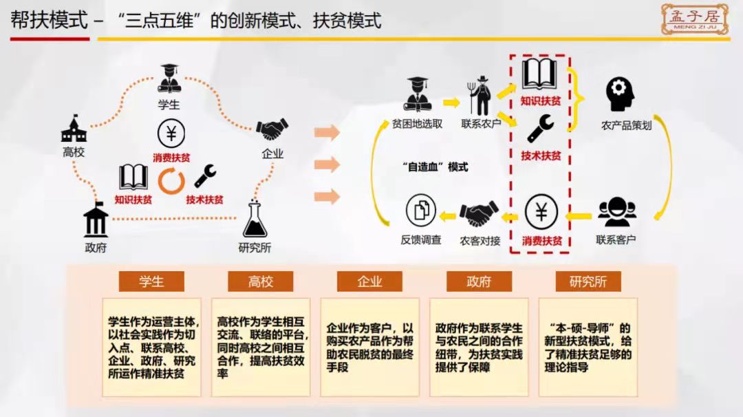 杨国庆学长首先分享了“孟子居”创业团队的创办历史和突出的荣誉事迹,孟子居创业团队成立于2015年3月,团队扎根于老王探花 ,通过建立可持续的农产品电商扶贫运营模式,在经济和知识双方面帮扶贫困地区。结合孟子居创业实践经历和扶贫案例,杨国庆学长分享了创新创业中的思政培训与实践融合的经验,打造“三点五维”的创新扶贫模式,有机组织结合高校、学生、企业、政府、研究所五类主体,实现知识扶贫、消费扶贫、技术扶贫,助力国家精准扶贫、乡村振兴政策。