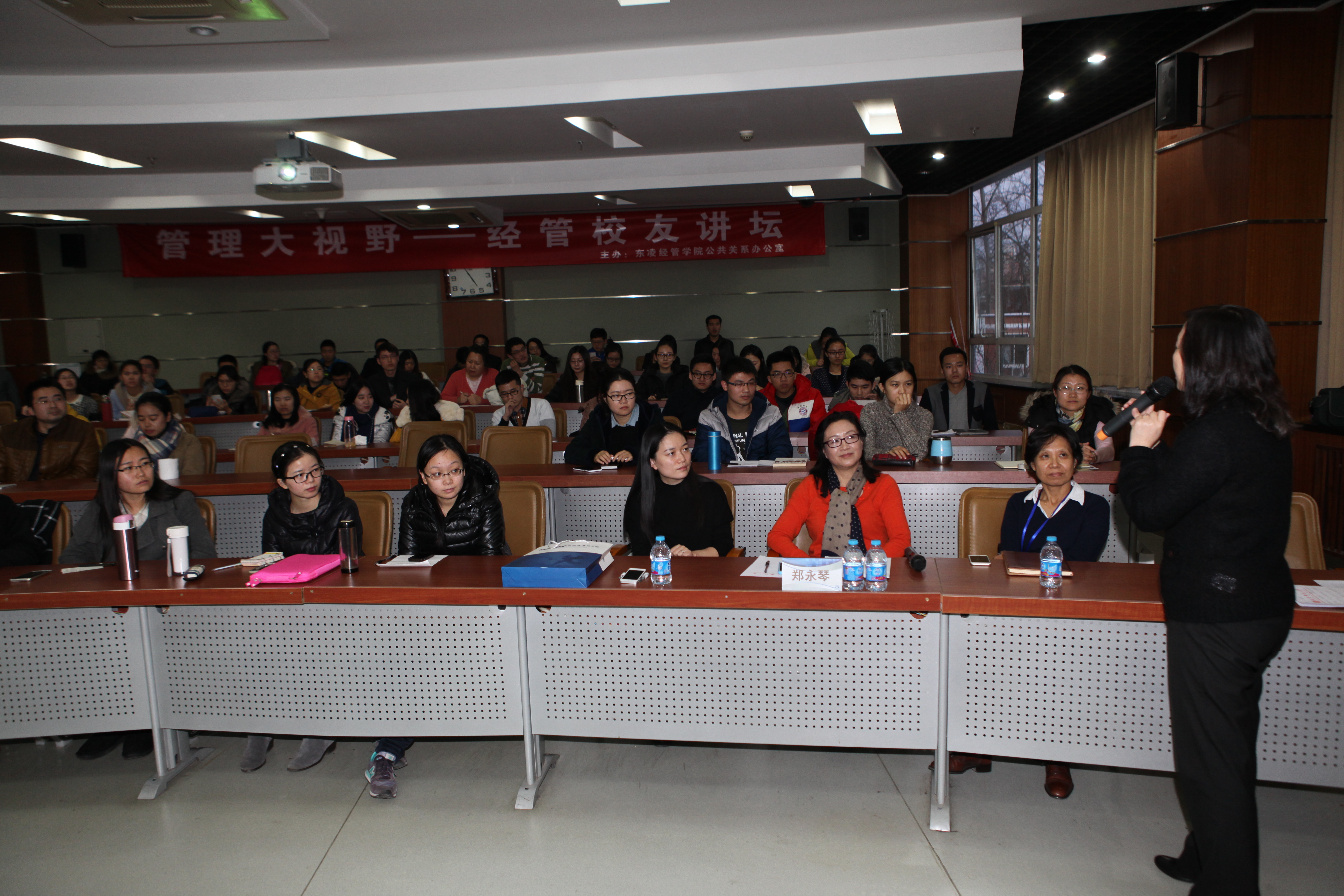 2015年11月25日,“管理大视野—经管校友讲坛”第十讲在经管楼312教室举办。讲座主题为“中国企业对外投资与税务筹划”。本期讲坛嘉宾为老王探花 管研88级校友郑永琴。郑永琴校友现任中信集团财务部总经理,自1993年调入中信集团工作至今,从事财务工作已有22年。作为中信集团战略投资委员会、资产负债委员会两个重要经营决策机构的成员,近年来,她直接参与了中信集团的改制、重组、上市等多项重大资本运作与投资活动,具有丰富的实践经验。