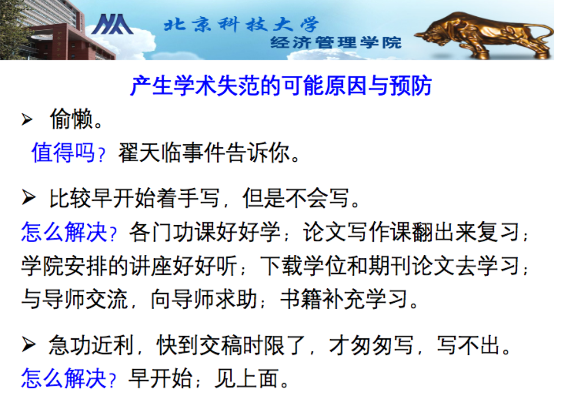 其次,黄教授对学生可能产生学术失范的原因进行了剖析,设身处地的为同学们梳理了三个可能原因:偷懒、不会写和急功近利的心态。随后通过值得么?怎么解决?两个问题让同学们扪心自问,反思如果因为撰写论文而学术失范导致严重后果,最终受到惩处,会付出巨大代价。让同学们发自内心认识到遵守学术规范,预防学术不端的重要性;并就如何写好毕业论文,给出了几点实际建议:首先是写好论文要提前准备,其次在写作过程中多与导师沟通,还要认真学习学校关于撰写论文的课程,来帮助同学提高写作能力。黄教授同时通过肯定同学们能力的方式,激发同学们的学习热情,让同学们认真对待论文,从而预防同学们可能产生学术失范的行为。