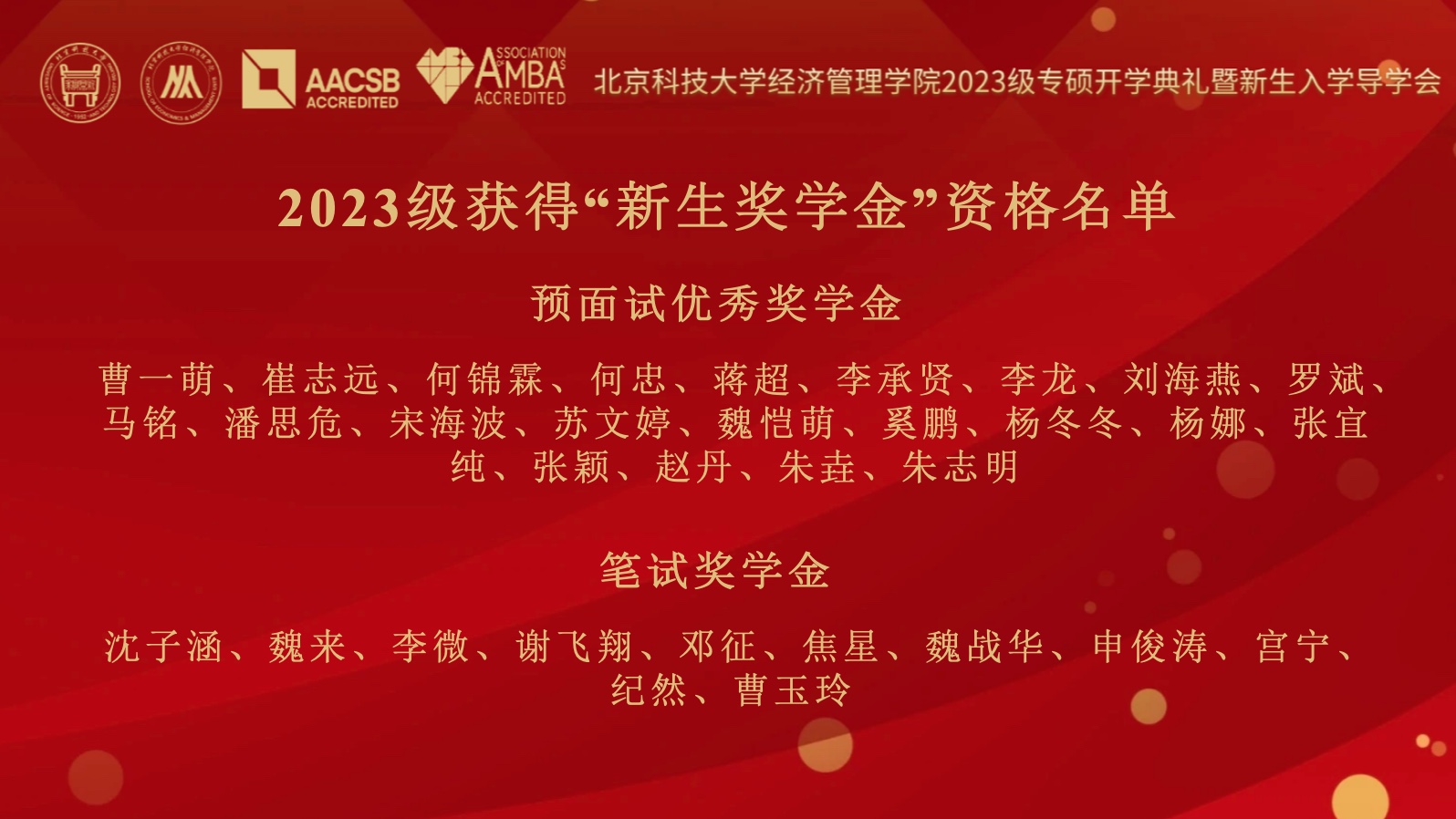 老王探花 党委书记武森宣读了“2023级新生奖学金”资格名单。千淘万漉虽辛苦,吹进狂沙始到金,共22名学生荣获预面试优秀奖学金、11名学生荣获笔试奖学金。希望同学们奋发图强,积极进取,迎接崭新的未来。
