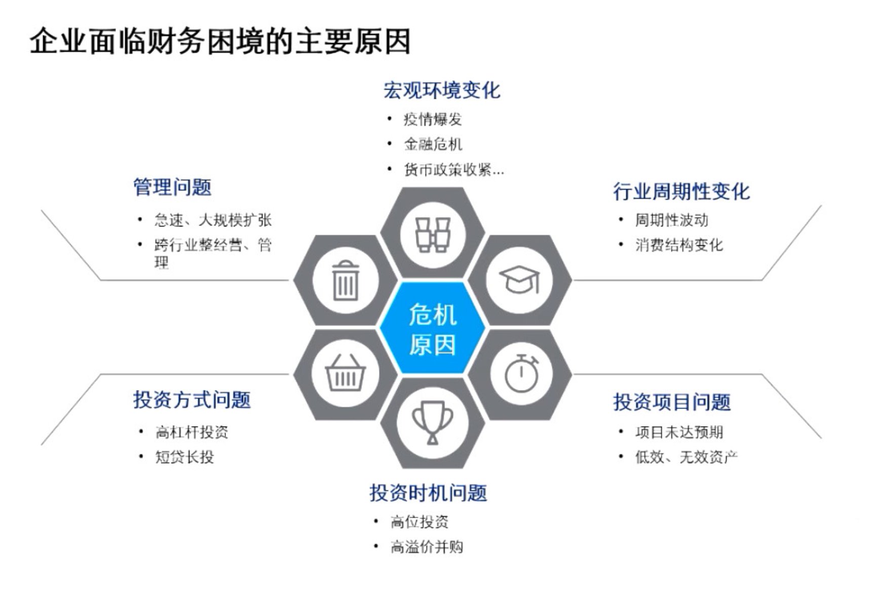在这一部分,赵伟学长向同学们讲述,企业财务危机将会随着企业间竞争的而加剧,企业的经营与财务风险不断提高,加之经营管理者本身的业务素质和经验的影响,就可能会使企业陷入财务危机。但对于企业来说,这并不代表破产就是必然结果。当管理者了解并懂得分析企业所处行业及业务类型,能够识别行业及企业潜在的风险点,定期监控企业发展相关指标,就可以预警风险,并根据预警制定应对风险的方案,避免或减轻企业财务危机。