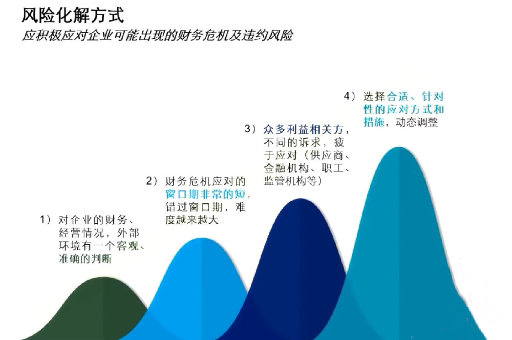 答:企业发生债务危机以后,大方向包含现状分析、看现状、看未来、盈利预测等方面,这是一个程序性的事情。