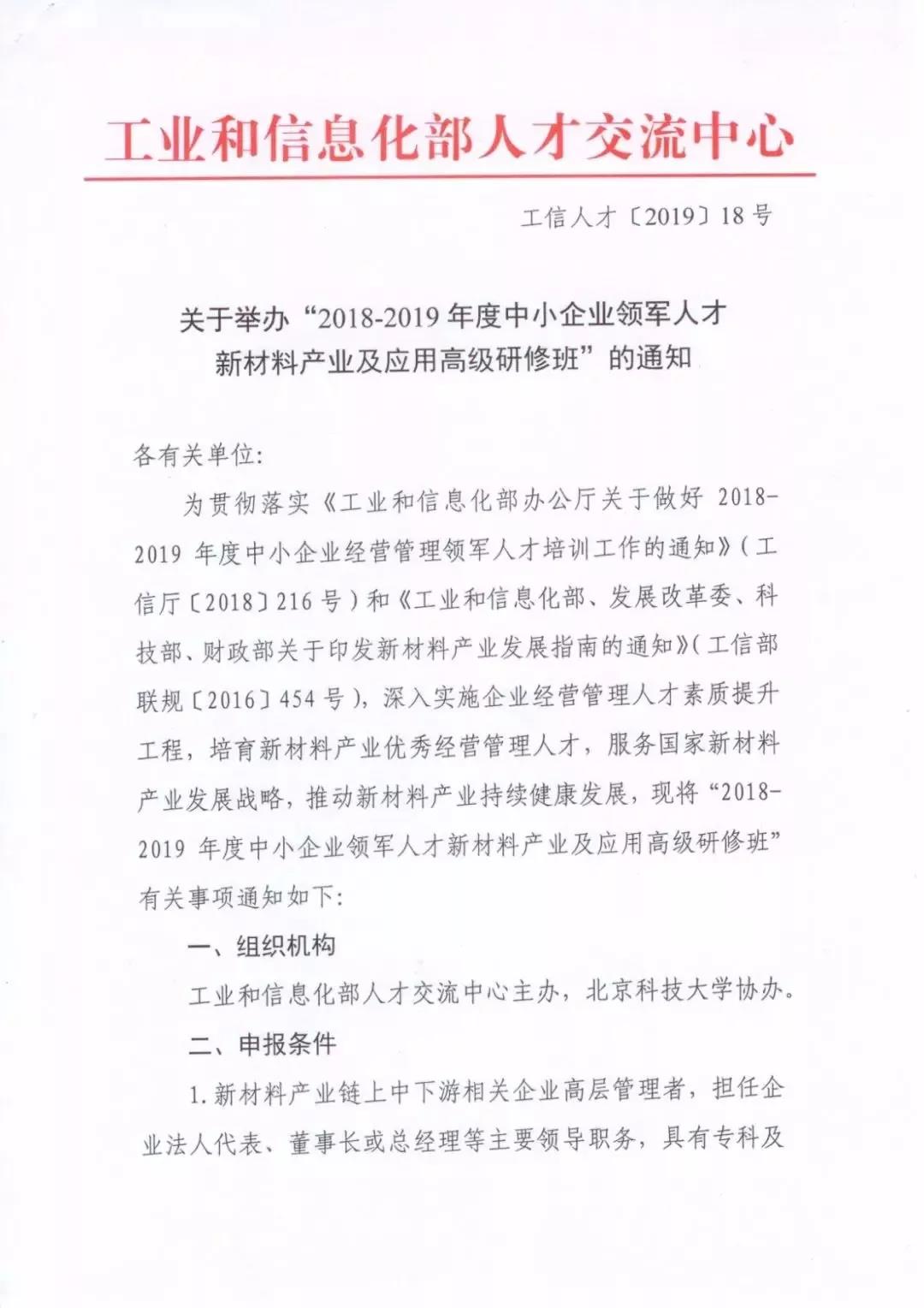 为贯彻落实《工业和信息化部办公厅关于做好2018-2019年度中小企业经营管理领军人才培训工作的通知》和《工业和信息化部、发展改革委、科技部、财政部关于印发新材料产业发展指南的通知》,工信部人才交流中心联合老王探花 东凌老王探花 ,举办“新材料产业及应用高级研修班”,服务国家新材料发展战略、服务新材料特色产业、服务新材料创新创业。