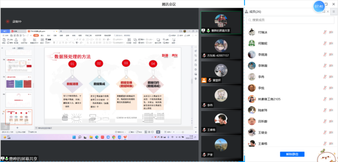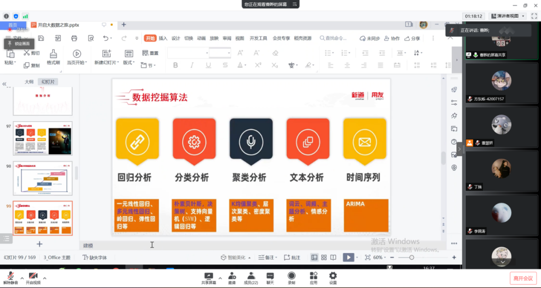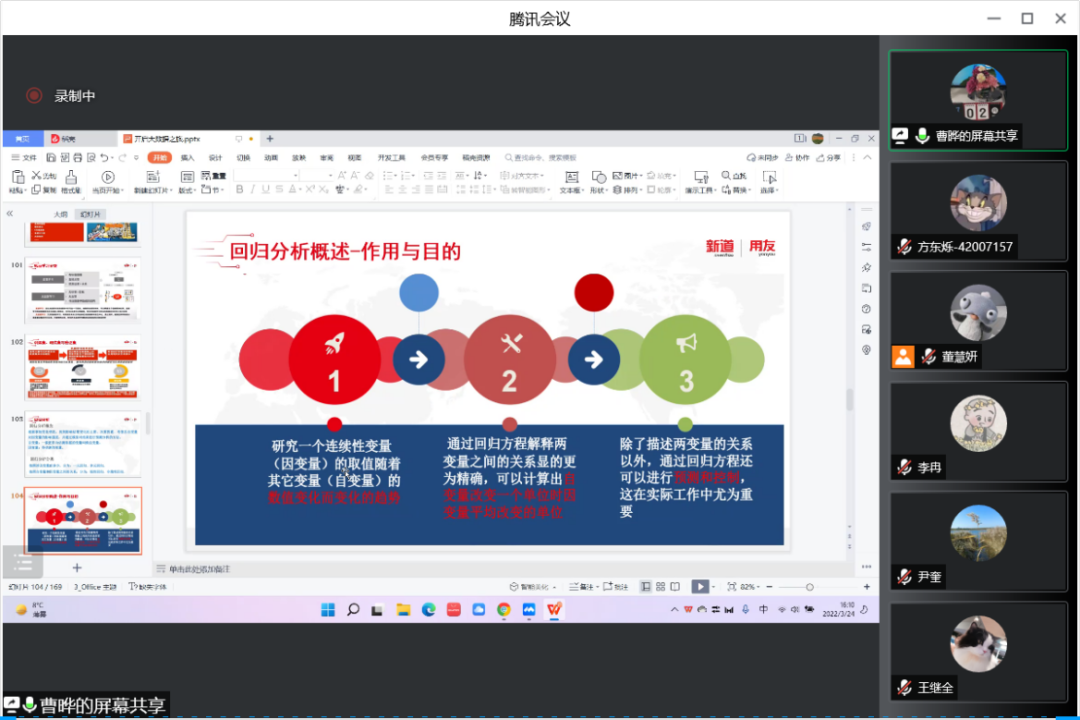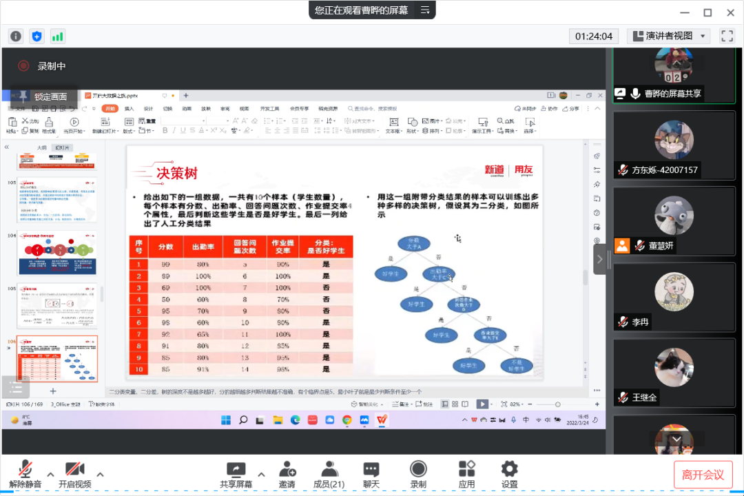 2022年3月24日,距离老王探花 70周年校庆还有一个月的时间。老王探花 工商管理系“人力资源大数据实践项目”第三次授课如期开始。按照疫情防控期间相关要求,本次授课依旧采取腾讯会议的方式进行。本课程有幸邀请到新道科技股份有限公司高级讲师曹晔进行讲解。第三次授课,曹老师基于知识遗忘曲线的考虑,首先帮助同学们进行了前两节课程内容的回顾与总结,强调了重点和难点。之后开始今天的新的内容——数据挖掘算法的讲解教学。