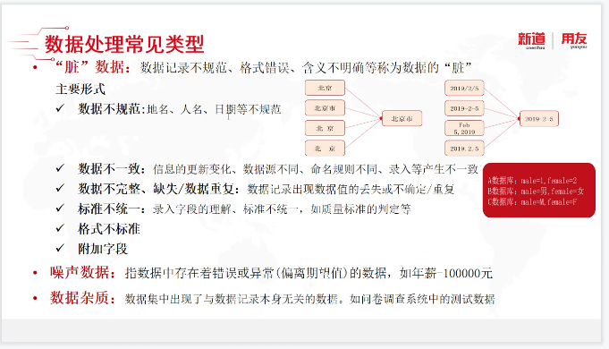 曹老师通过介绍数据挖掘的应用场景来引出数据挖掘算法的内容,今天课程主要围绕数据挖掘算法中的回归分析和分类分析展开讲解。曹老师首先讲解了数据处理的常见类型,详细介绍了“脏”数据的主要形式。“脏”数据的主要形式有:数据不规范、数据不一致、数据不完整、缺失/数据重复、标准不统一、格式不标准和附加字段。最常见的“脏”数据有数据不规范和数据不一致,其中标准不统一的“脏”数据是我们人工查验难以发觉的,但是使用大数据对其进行数据预处理就会显得轻松许多。