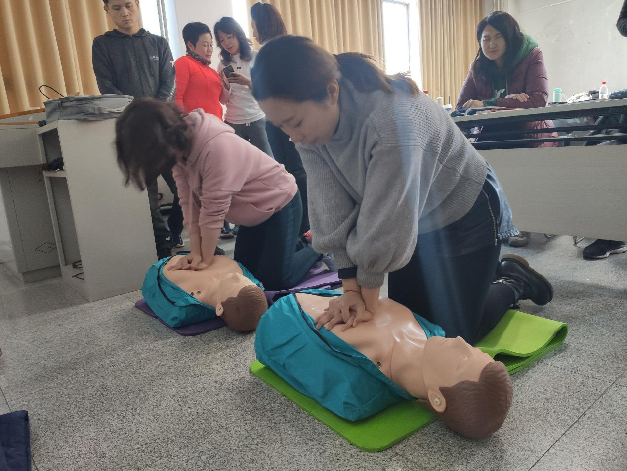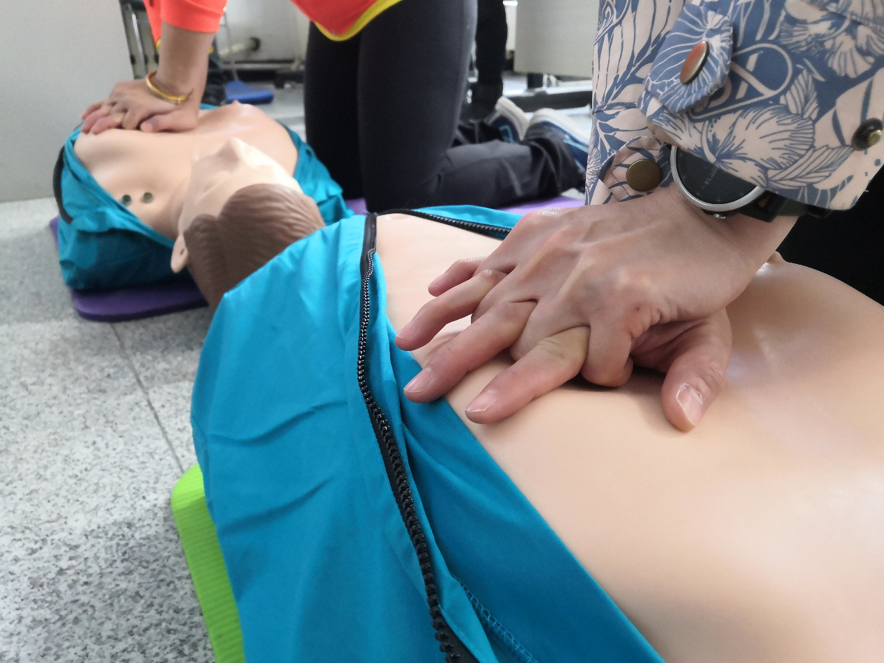 朱青竹老师根据课程内容对于根据课程内容对于应急救护基础、应对内科急症、意外伤害、突发事件等现场的应急救护方法、 自动体外除颤器(AED)的使用方法逐一讲授并带领学员进行练习。