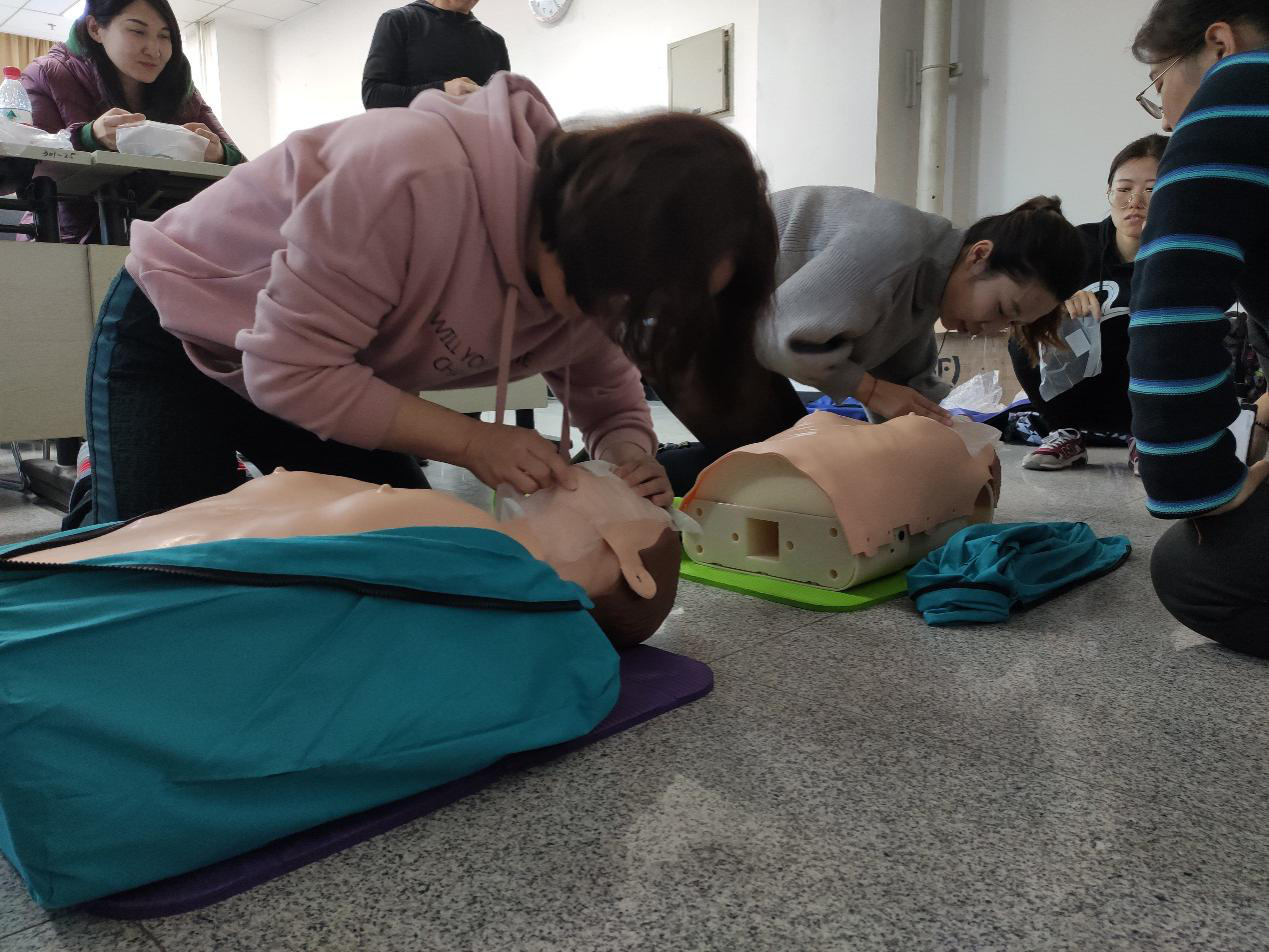 何润宇老师、张东刚在朱青竹老师的指导下进行心肺复苏练习