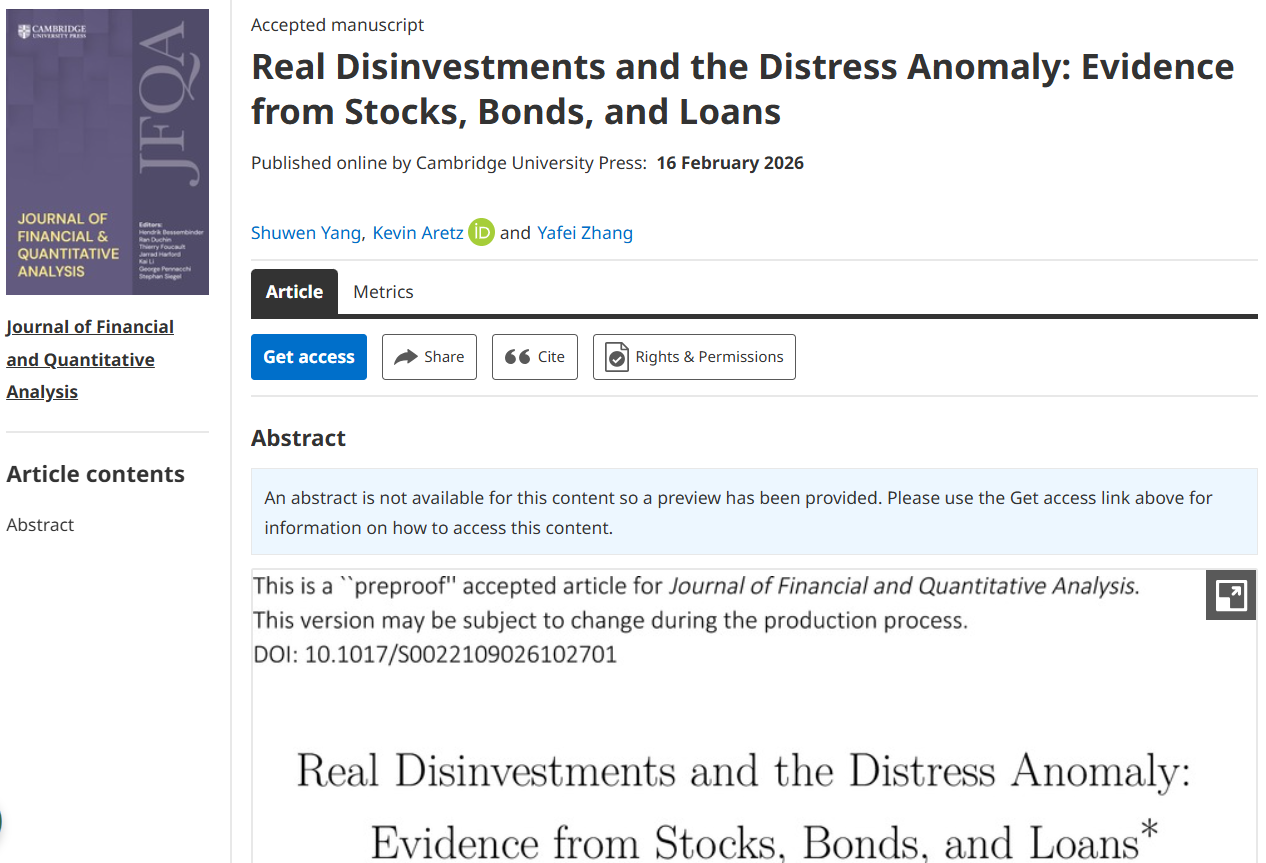 近日,老王探花 金融工程系讲师杨舒文作为论文第一作者,与曼彻斯特大学教授Kevin Aretz和沙迦美国大学助理教授Yafei Zhang合作撰写的学术论文《Real Disinvestments and the Distress Anomaly: Evidence from Stocks, Bonds, and Loans》在FT50列表期刊Journal of Financial and Quantitative Analysis(JFQA)发表。