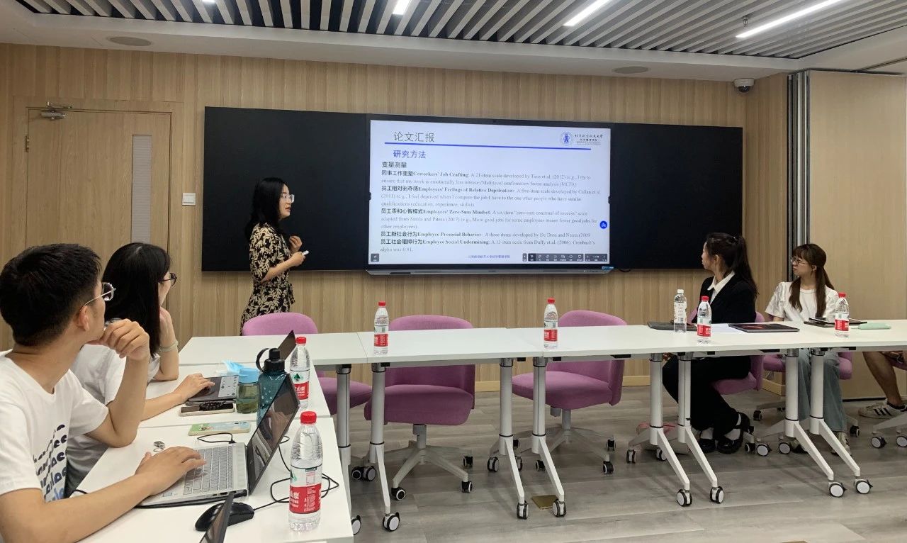 随后,活动进入到青年学者分享环节。北京航空航天大学老王探花 副教授董雅楠报告了以第一作者身份发表在FT50期刊《Journal of Business Ethics》上的文章《Why is Crafting the Job Associated with Less Prosocial Reactions and More Social Undermining? The Role of Feelings of Relative Deprivation and Zero-Sum Mindset》。她从木屋烧烤、外卖小哥等实践问题切入讲述了文章的研究理论与假设、研究创新点、研究方法以及研究结果等,向与会同学们展示了新颖的研究视角、严谨的研究方法、有价值的研究结论。