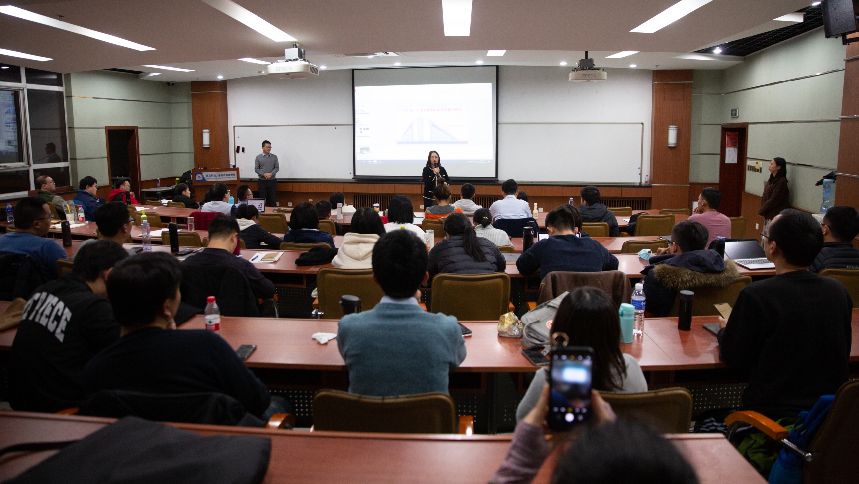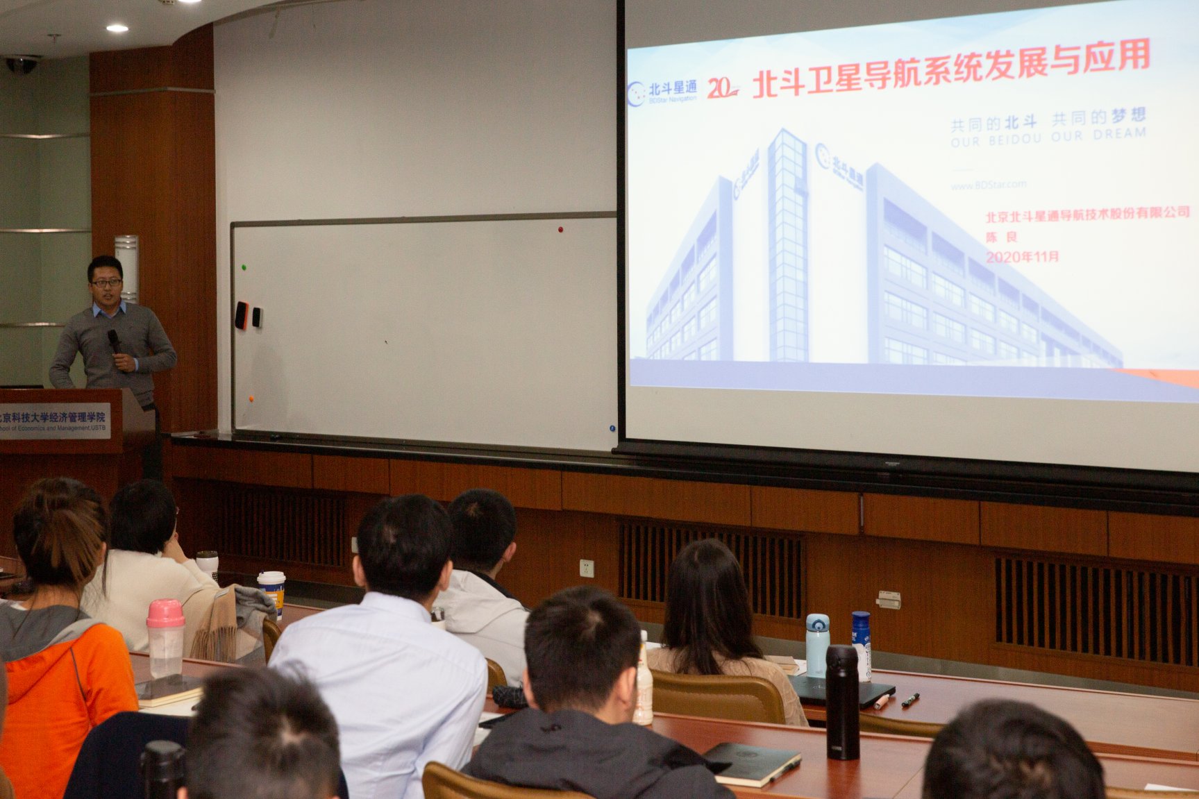此外,对于同学们比较疑惑的问题:为何我国的北斗发展技术已经达到了国际较高水水平,但是在日常生活中我们的手机导航等还是用的美国的GPS导航?陈博士解释道,北斗应用正在迈向“标配化”发展的新阶段。目前国内外主流芯片厂商已推出兼容北斗的通导一体化芯片,智能手机已成为卫星导航系统最主要的应用领域之一。目前手机上的GPS已经成为了卫星导航的统称,不仅仅只接收到美国的GPS卫星导航的信号,如果手机的硬件支持,同样能够接受北斗的卫星导航信号,而手机北斗定位支持率达到75%。专业的解答让我们对于国家的北斗技术有了更强的自信,同时与陈博士的互动也让我们对北斗技术与企业应用有了更深入的了解。