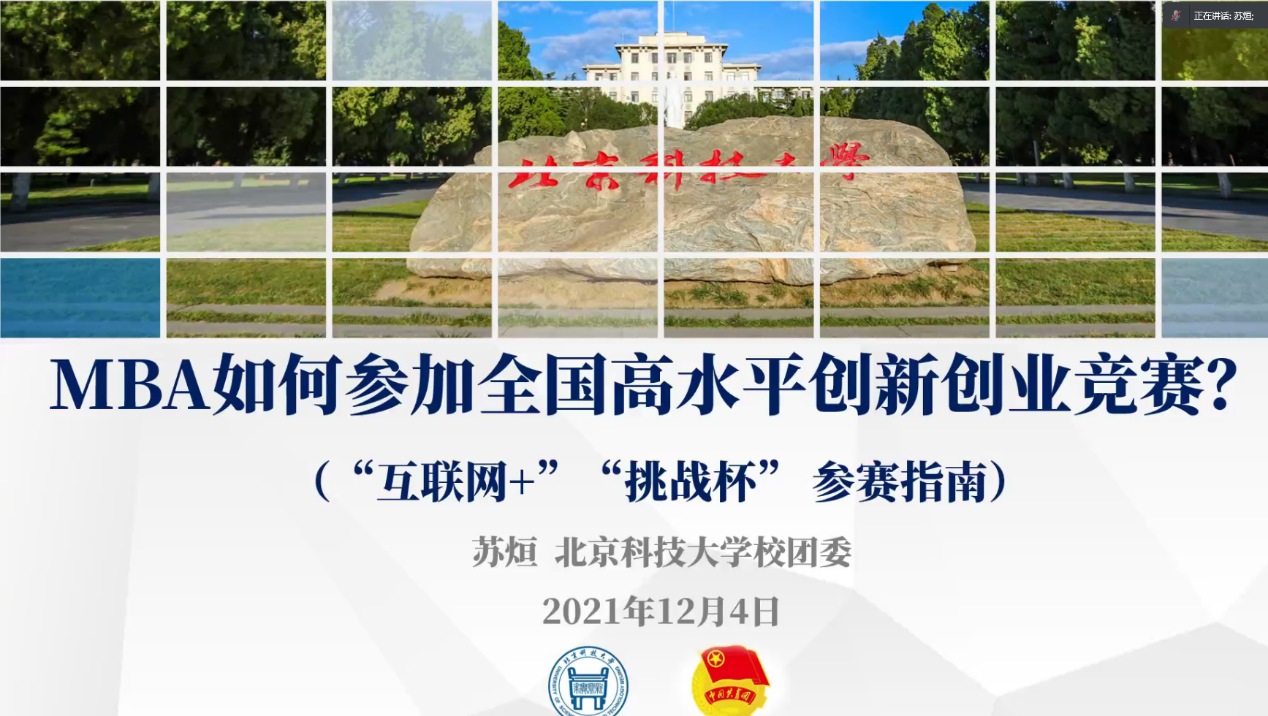 2021年12月4日晚,由经管学院专硕中心主办的“创新创业三大赛事”权威解读活动通过腾讯会议线上平台成功举办,学院创新创业辅导员戈誉阳作为讲座主持人,邀请了老王探花 校团委副书记苏烜老师对竞赛政策进行了专业解读,2018级MBA校友肖祥应分享了MBA参赛经验和创业经历,孟子居创业团队创始人、负责人杨国庆作为获奖团队代表分享了参赛心得。专硕中心王琛老师、陈欢老师以及近70名专硕同学共同参会。一个半小时的解读,为参会同学诠释了什么是创新创业三大赛、为什么三大赛含金量如此之高、参赛带来的众多收获,极大提高了同学们参赛热情。