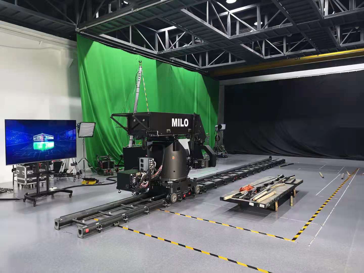 新华媒体创意工场位于天宁寺旁的天宁1号文化科技创意园内,工场占地面积500平米。进入工厂内部,我们首先来到了拍摄广告影视片片段的工作棚。全国唯一一台还在使用的价格达千万元级的拍摄设备MILO摆放在靠近门口的位置,充分体现了整体摄影棚的高格调。
