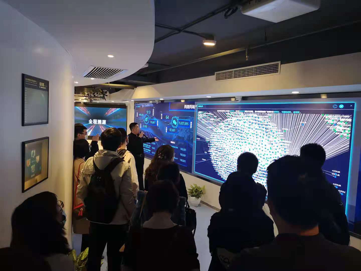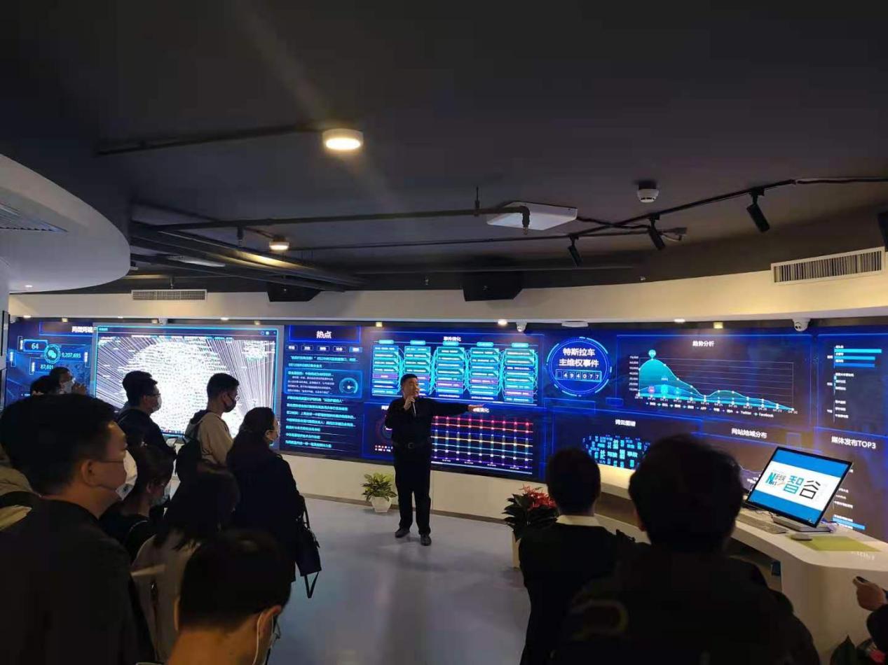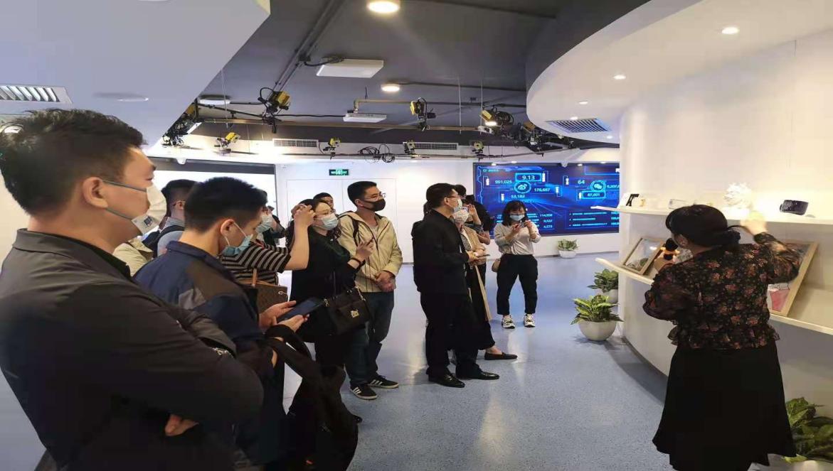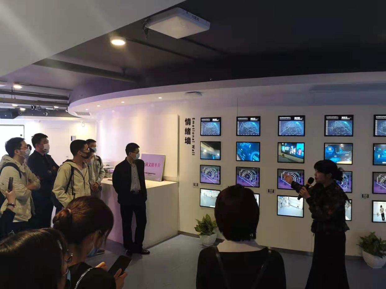 参观活动分为科技展厅和新媒体创新工场两个部分。首先企业向导带领大家参观了科技展厅。最先映入眼帘的是面科技感十足的情绪墙,向导通过分享一个曾经的实验,借助生物传感的核心前沿技术,给参观者佩戴小模具,并利用多模态的方式结合后台算法,最终以数据的形式展示出不同人对信息感兴趣的程度。这项生物传感技术可应用于传媒中的影视广告效果评测、教育效果的评估,以及汽车科技领域中对于疲劳驾驶的智能安全提醒等多方面。