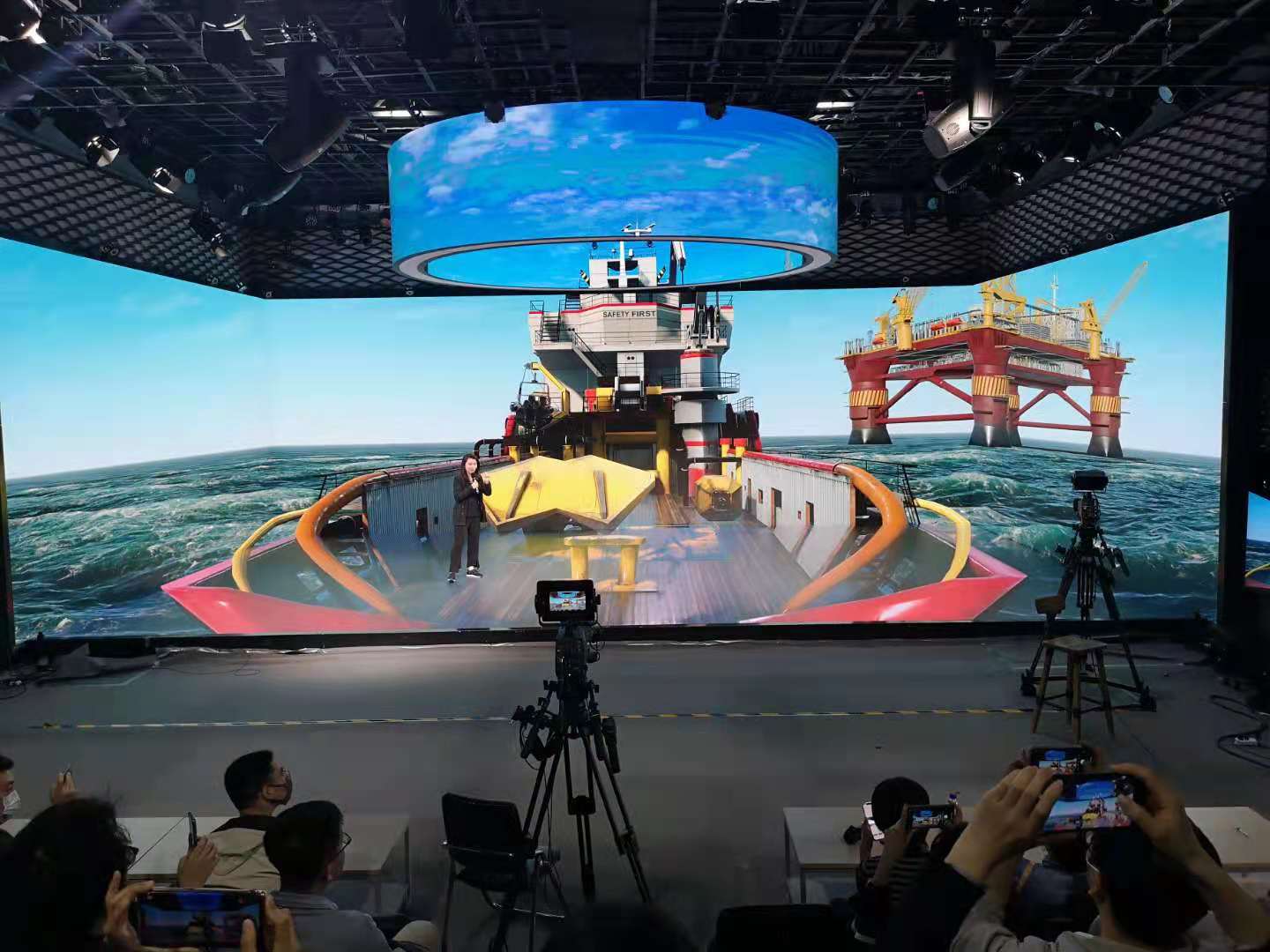 沉浸式的舞台,把静态与动态中的画面完美融合展现,带给观影者更生动的感官体验。另外,快速切换背景的功能特点,可以同时满足多种场景需求,舞台顶部的红外检测设备,可以在舞台上随时加入仿真动画动态效果。