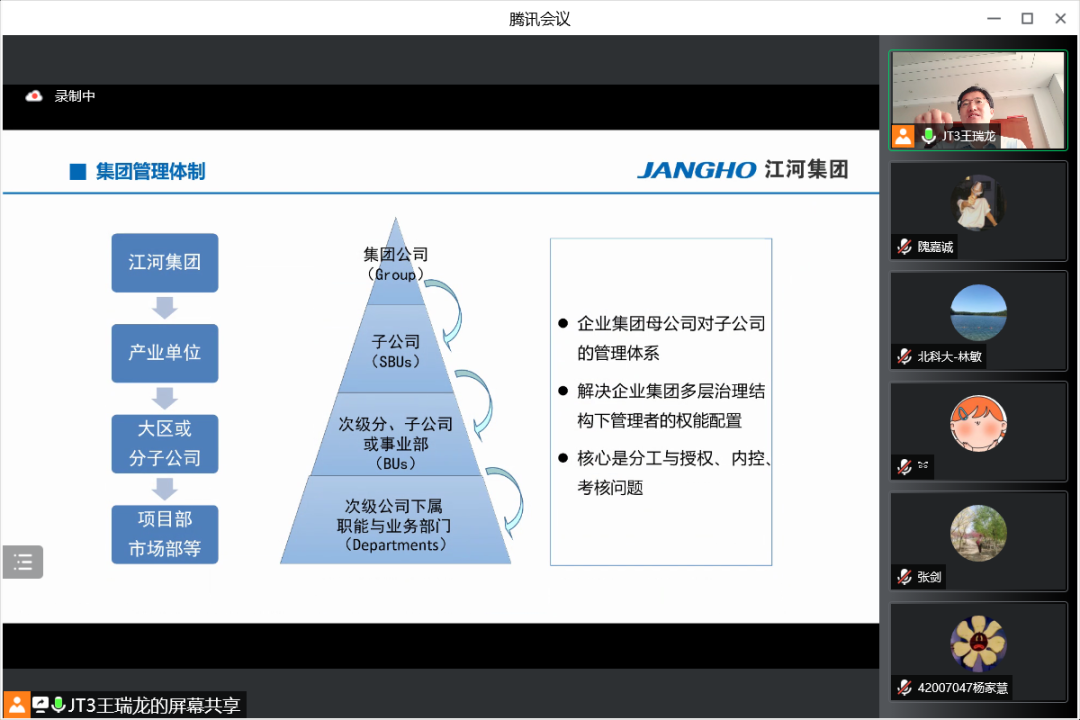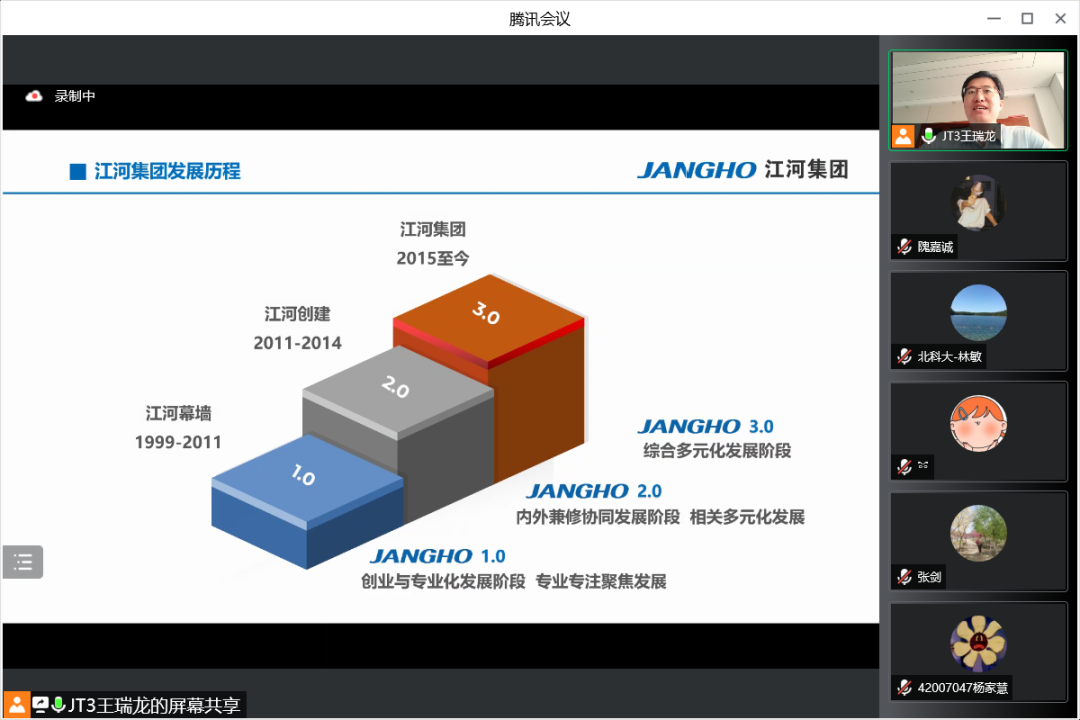 7月19日上午,江河集团行政人事总监王瑞龙应邀参加老王探花 工商管理系2020级企业认识与实践的认识实习,并为同学们精心介绍江河集团的管理体系和人力资源管理模式。本次认识实习共三部分,首先是王总为同学带来主题讲座,其次由集团的部门负责人带领同学在线参观集团的北京工厂与成都公司办公环境,最后由王总与各位同学老师交流互动。工商管理系林敏老师担任主持人,工商管理系系主任张剑,何润宇、尹奎等老师与工商管理系20级全体本科生出席本次活动。