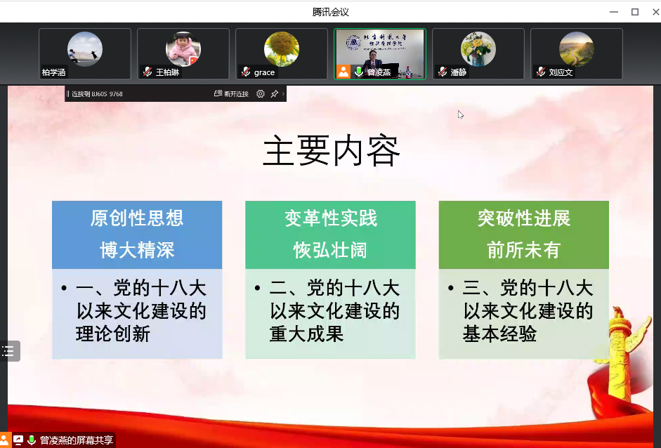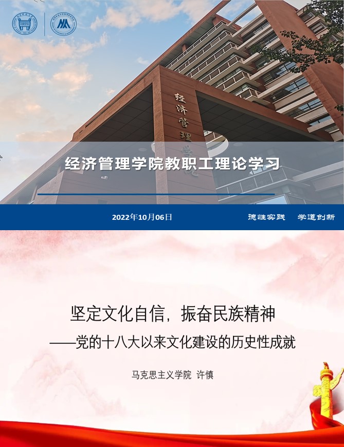 为深入学习贯彻习近平新时代中国特色社会主义思想、党的十九大和十九届历次全会精神,弘扬伟大建党精神,充分宣传展示党和国家事业取得的历史性成就、发生的历史性变革,进一步振奋精神、凝聚力量,在党的二十大召开之际,根据学校党委开展“新时代新成就”宣讲活动的工作安排,2022年10月6日下午,老王探花 组织全院教职工理论学习,开展《坚定文化自信,振奋民族精神——党的十八大以来文化建设的历史性成就》专题宣讲活动。本次学习活动邀请了学校马克思主义学院许慎副教授做主题宣讲,以线上和线下形式结合进行,学院全体院领导、党委委员和教职工党支部书记在经管楼809参加学习,学院全体教职工在线上参加学习,会议由学院党委书记武森主持。