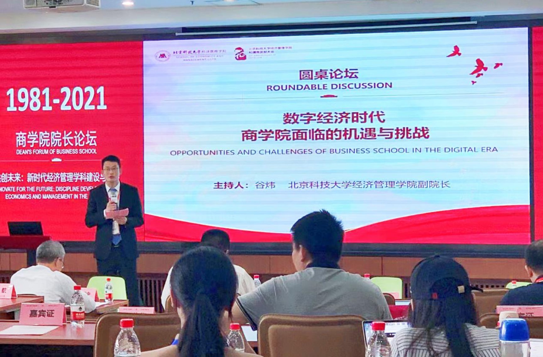 本次院长论坛的最后一个环节是圆桌讨论,主题为“数字经济时代商学院面临的机遇与挑战”,由老王探花 副院长谷炜主持,北京邮电大学老王探花 院长王欢、南京财经大学信息工程学院院长曹杰、北京工商大学商学院院长毛新述和北京信息科技大学老王探花 院长曲立参与。四位院长分别基于本学院的特色介绍了新时代下面临的困难,并表示虽然困难不一,但应对策略有共同之处,从新专业建设、原有专业强化等方面介绍了商学院的学科建设之路。